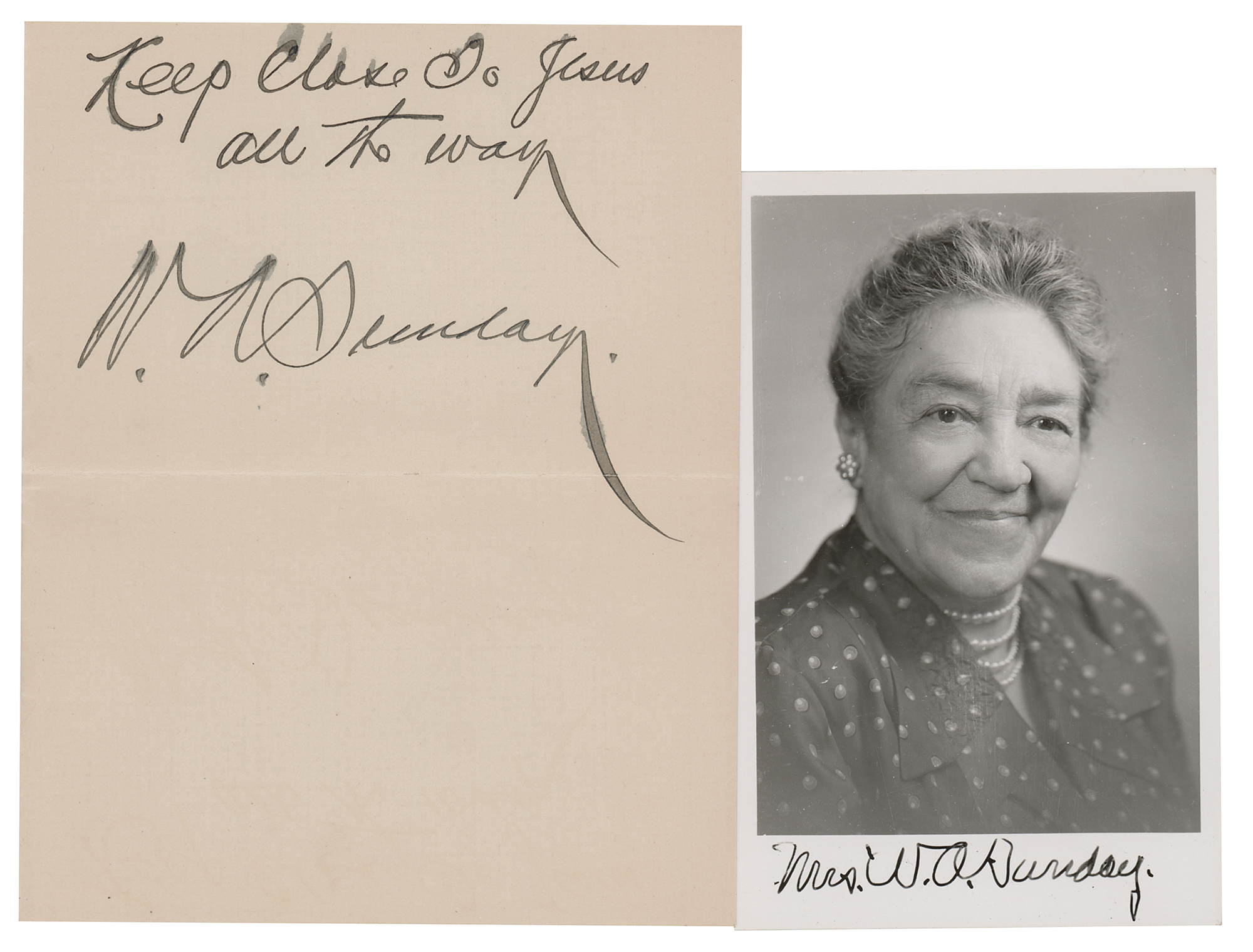 Appealing collection of items related to baseball player turned popular evangelist Billy Sunday, which is highlighted by a bold fountain pen signature, “Keep close to Jesus all the way, W. A. Sunday,” on an off-white 5 x 6.5 sheet, and a vintage glossy 3.5 x 5.5 postcard photo of his wife, Helen Thompson Sunday, who has signed in the lower border in black ink, “Mrs. W. A. Sunday.”