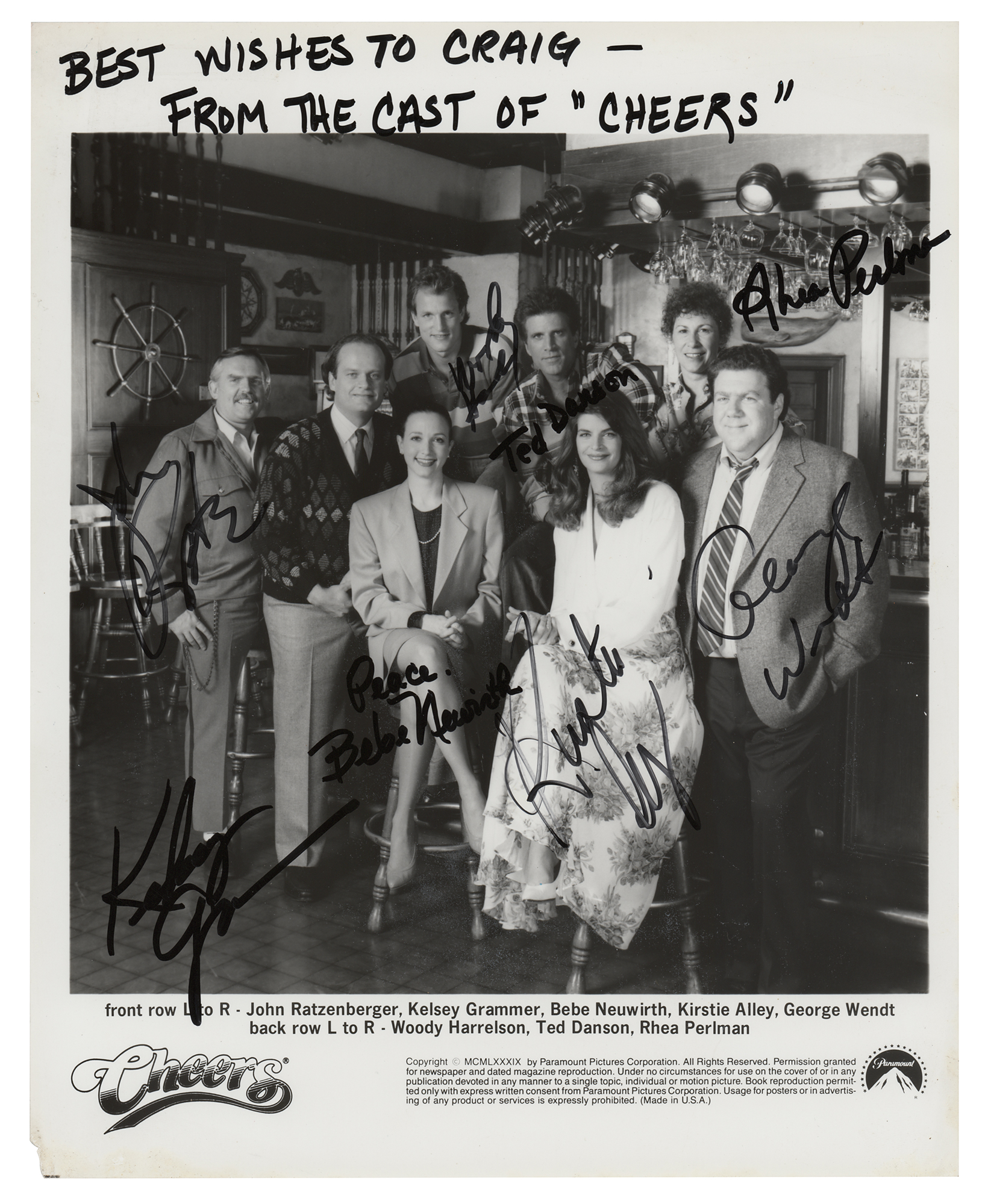 Glossy 8 x 10 Paramount promo photo of the Cheers cast, signed in black felt tip by John Ratzenberger, Kelsey Grammer, Bebe Neuwirth, Kirstie Alley, George Wendt, Woody Harrelson, Ted Danson, and Rhea Perlman, with an inscription across the top in an unknown hand: "Best wishes to Craig—From the Cast of 'Cheers.'" In fine condition, with light staining along the bottom edge.