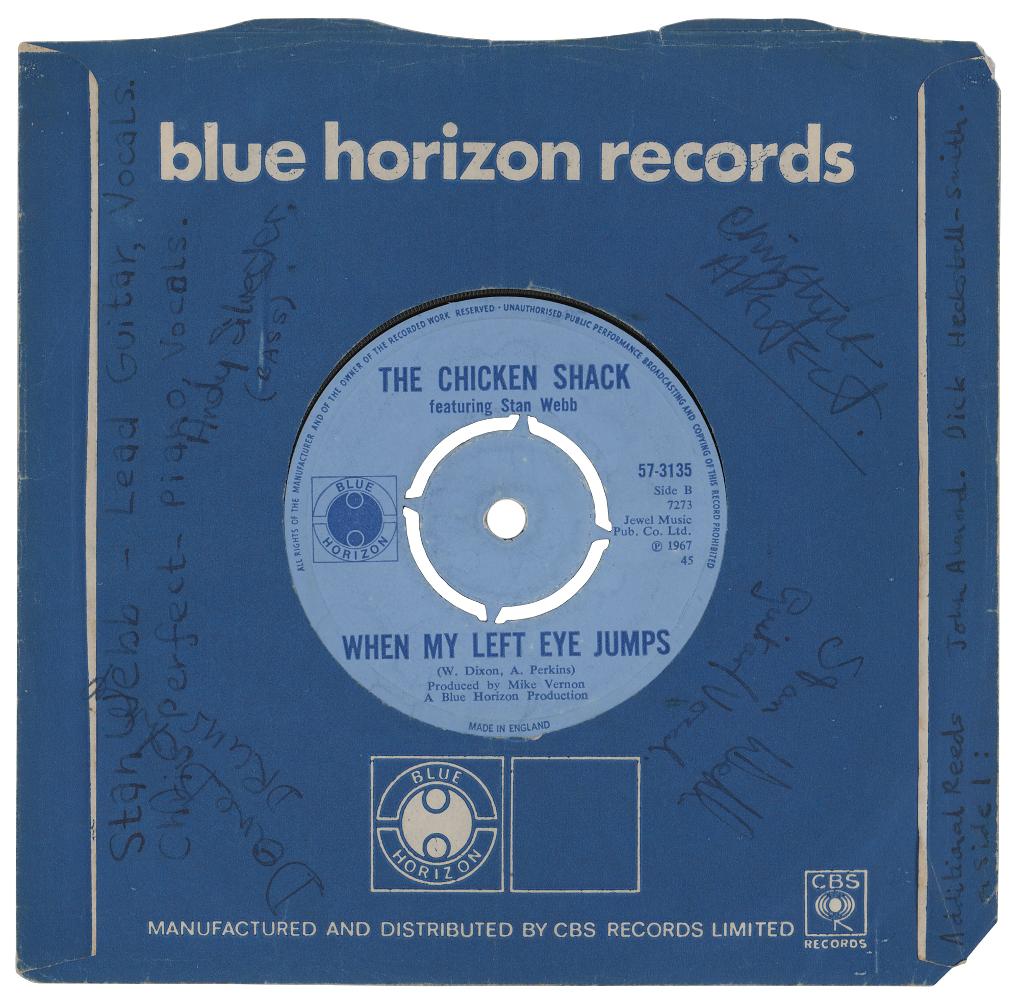 Blue Horizon Records 45 RPM single record for 'It's Okay With Me Baby / When My Left Eye Jumps,' released in early 1968, signed on the sleeve in ink, "Christine A. Perfect" (later Fleetwood Mac's Chrstine McVie), "Stan Webb, Guitar/Vocals," "Dave Bidwell, Drums," and "Andy Silvester, (Bass)." The sleeve also has a few annotations noting the members (impinging on the Bidwell and Silverster signatures), and the group's name written in bubble letters on the opposite side. In very good to fine condition, with light edge creasing, and moderate signature contrast. The record is included. A rare, super early autograph of Christine McVie using her maiden name; she married John McVie in 1968, and joined Fleetwood Mac in 1970.
