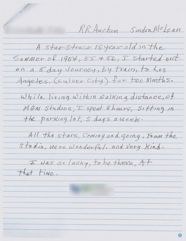 Accompanied by a copy of a letter of provenance from the original recipient, Sondra McLean, who as a teenager traveled by train from her hometown in Canada to Los Angeles, California, where she spent two-month-long vacations in the summers of 1954, 1955, and 1956. While staying with her cousin, whose residence was within walking distance from MGM Studios, McLean used the majority of her weekdays staking out the studio parking lot for the arrival and departure of Hollywood celebrities. McLean’s decision to photograph each movie star at the time of their signing elevates her collection into top-tier status.