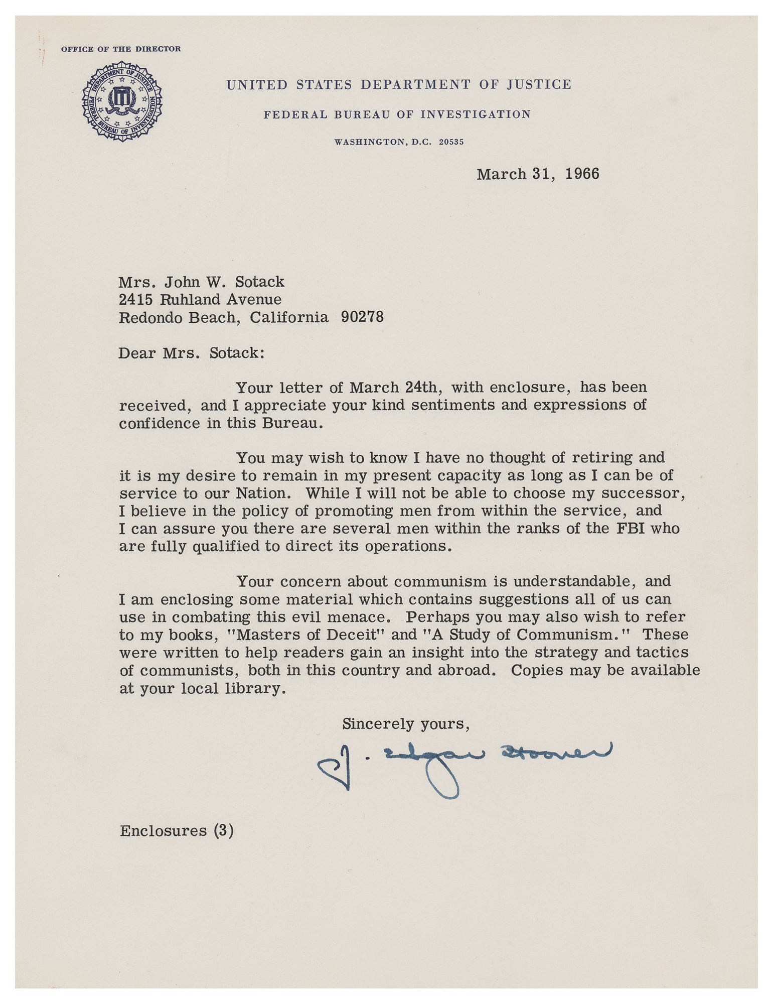 TLS, one page, 8 x 10.5, Federal Bureau of Investigation letterhead, March 31, 1966. Letter to Mrs. John W. Sotack, in part: "You may wish to know I have no thought of retiring and it is my desire to remain in my present capacity as long as I can be of service to our Nation. While I will not be able to choose my successor, I believe in the policy of promoting men from within the service, and I can assure you there are several men within the ranks of the FBI who are fully qualified to direct its operations. Your concern about communism is understandable, and I am enclosing some material which contains suggestions all of us can use in combating this evil menace. Perhaps you may also wish to refer to my books, 'Masters of Deceit' and 'A Study of Communism,' These were written to help readers gain an insight into the strategy and tactics of communists, both in this country and abroad." In fine condition. Accompanied by two articles by Hoover on communism, a press release of an address on the subject, and the original mailing envelope.