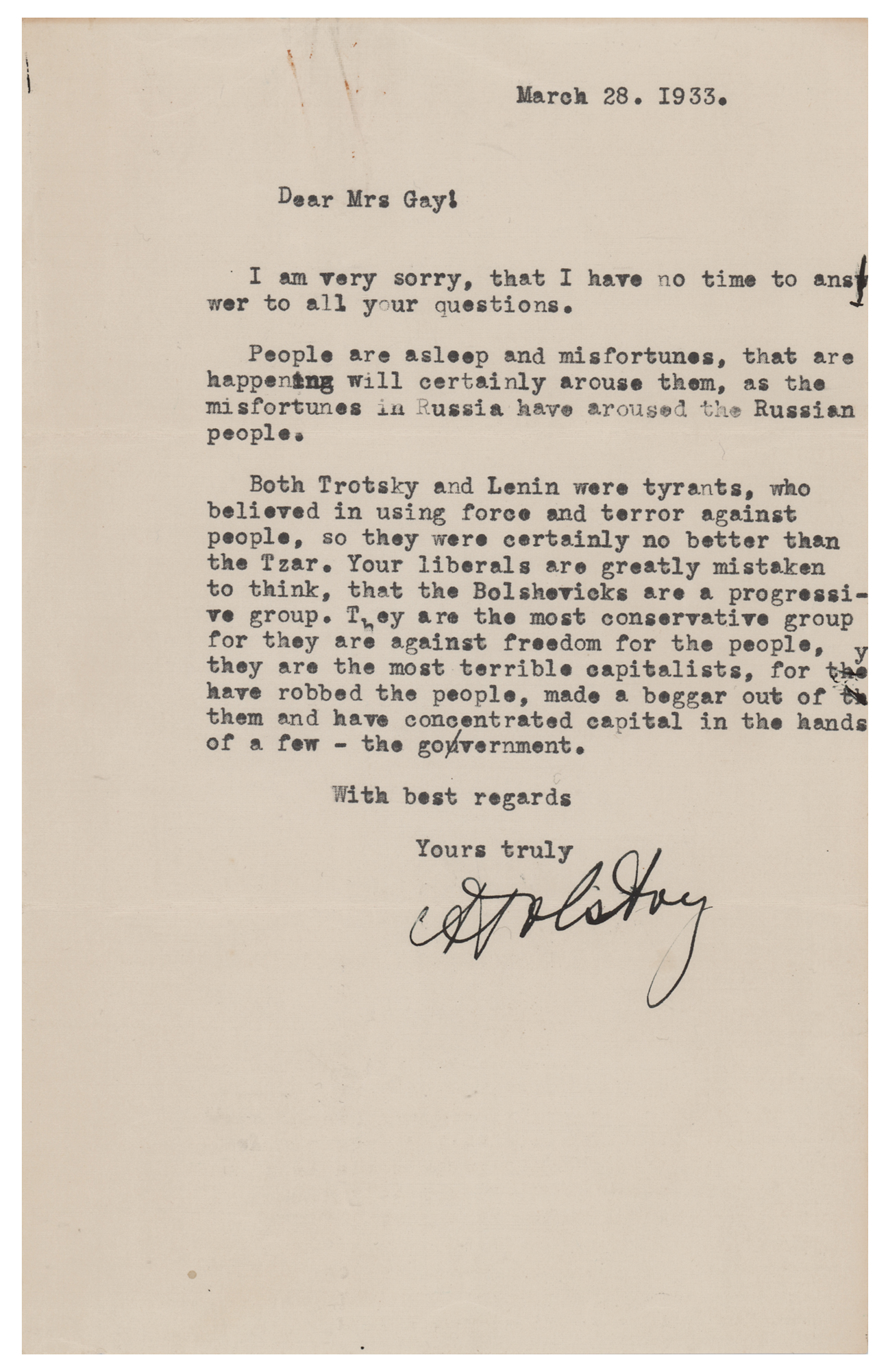 Youngest daughter (1884-1979) and secretary of the noted Russian novelist Leo Tolstoy. TLS signed “A. Tolstoy,” one page, 5 x 8, March 28, 1933. Letter to Mrs. John B. Gay, in part: "People are asleep and misfortunes, that are happening will certainly arouse them, as the misfortunes in Russia have aroused the Russian people. Both Trotsky and Lenin were tyrants, who believed in using force and terror against people, so they were certainly no better than the Tzar. Your liberals are greatly mistaken to think, that the Bolshevicks are a progressive group. They are the most conservative group for they are against freedom for the people they are the most terrible capitalists, for they have robbed the people, made a beggar out of them and have concentrated capital in the hands of a few—the government." In very good to fine condition, with light creasing, and a paperclip impression to the top edge. Accompanied by the original mailing envelope.