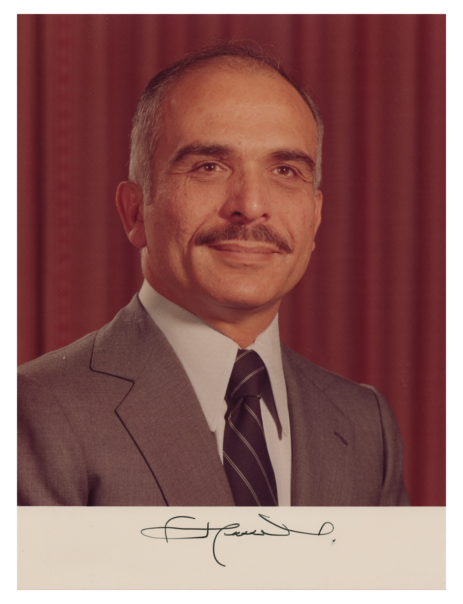 Color satin-finish 7.25 x 9.5 photo of King Hussein of Jordan in a suit and tie, signed in the lower border in black felt tip. In fine condition.