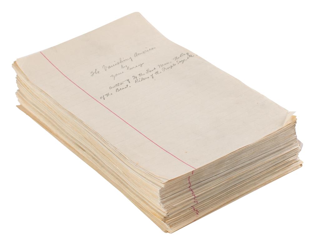 Autograph manuscript in pencil by Zane Grey for his 1925 novel The Vanishing American, totaling 546 single-sided pages (numbered 1-513 plus an additional section numbered 403-435), 7.75 x 12.5, titled and signed on the first page, "The Vanishing American by Zane Grey, Author of To the Last Man, The Day of the Beast, Riders of the Purple Sage, etc." Grey's story begins: "At sunrise Nophaie drove his flock of sheep and goats out upon the sage slopes of the desert. The April air was cold and keen, fragrant with the dry tang of the uplands. Taddy and Tinny, his shepherd dogs, had wary eye and warning bark for the careless stragglers of the flock. Gray gaunt forms of wolf and tawny shape of wild cat moved like shadows through the sage." In overall fine condition. Accompanied by a custom-made clamshell case, and the April 2014 issue of the Zane Grey Review, which features multiple articles discussing The Vanishing American; these articles point out the existence of four different endings in the published versions of the text.