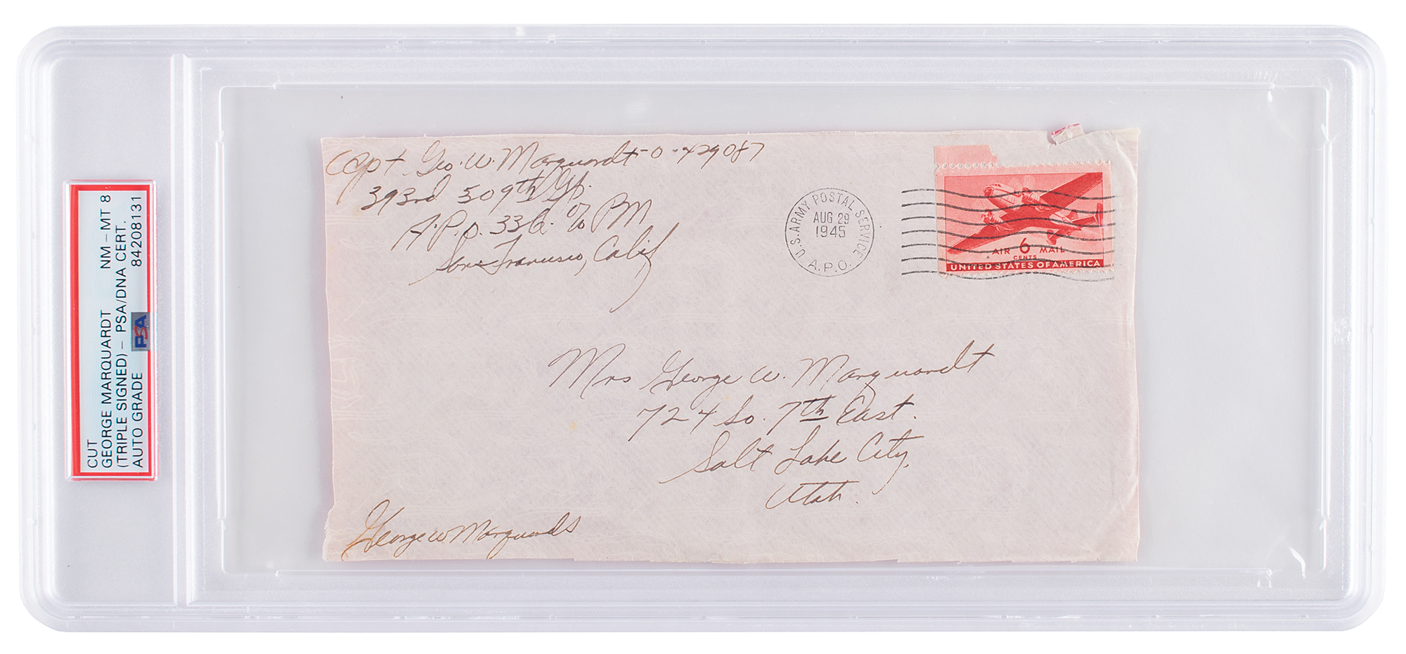 Army Air Forces pilot who took part in the World War II atomic bomb raids on Hiroshima and Nagasaki as commander of the Necessary Evil. World War II-dated hand-addressed and signed envelope panel, 7.25 x 4, postmarked August 29, 1945, addressed by Marquardt to his wife, "Mrs. George W. Marquardt, 724 So. 7th East, Salt Lake City, Utah," signed in the lower left corner, "George W. Marquardt." Marquardt also incorporates his name and rank as part of his return address in the upper left, "Capt. Geo. W. Marquardt." In fine condition. Encapsulated in a PSA/DNA authentication holder, grading the autograph as "NM-MT 8."