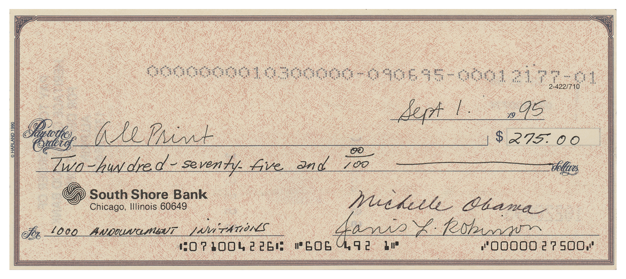 South Shore Bank check, 7.75 x 3.25, partially filled out and signed by Obama, "Michelle Obama," payable to All Print for $275, September 1, 1995. Obama fills out the amount and the memo, "1000 Announcement Invitations"; her sister-in-law, Janis L. Robinson, also signs, filling out the date and recipient. In very fine condition. These announcement invitations were most likely associated with Barack Obama's run for an Illinois state senate seat—he began fundraising in July 1995, created a campaign committee on August 7th, and filed its statement of organization on September 5th. On September 19, 1995, the 34-year-old Barack Obama announced his candidacy to a standing-room-only audience of 200 supporters at the Ramada Inn Lakeshore. He would go on to win the November 1996 election, taking 82% of the vote. Rare in this format, this is the first Michelle Obama check we have offered.