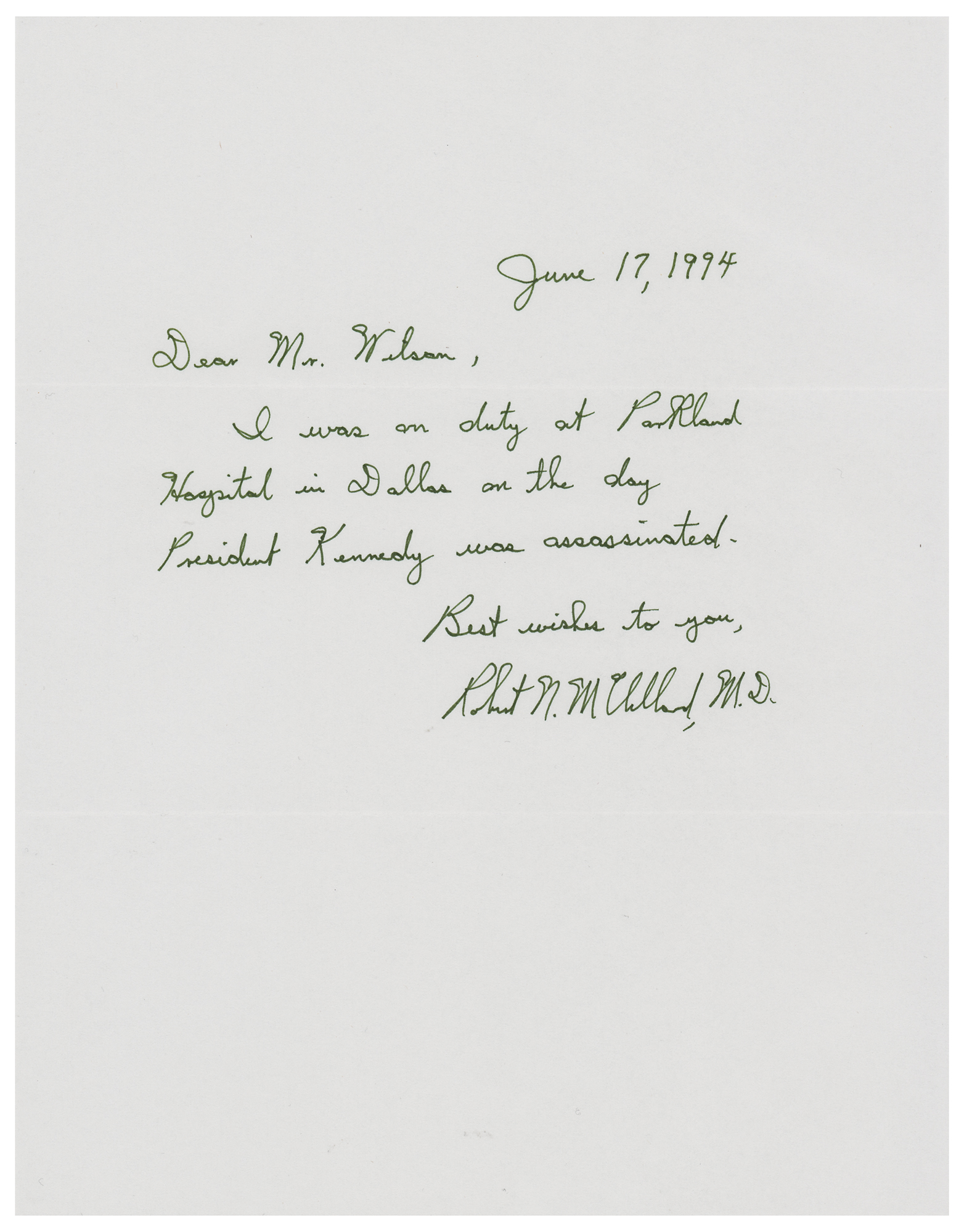 American surgeon (1929-2019) who attended to President John F. Kennedy at Parkland Memorial Hospital on November 22, 1963. ALS signed “Robert N. McClelland, M.D.,” one page, 8.5 x 11, June 17, 1994. Letter to "Mr. Wilson," in full: "I was on duty at Parkland Hospital in Dallas on the day President Kennedy was assassinated." In fine condition.