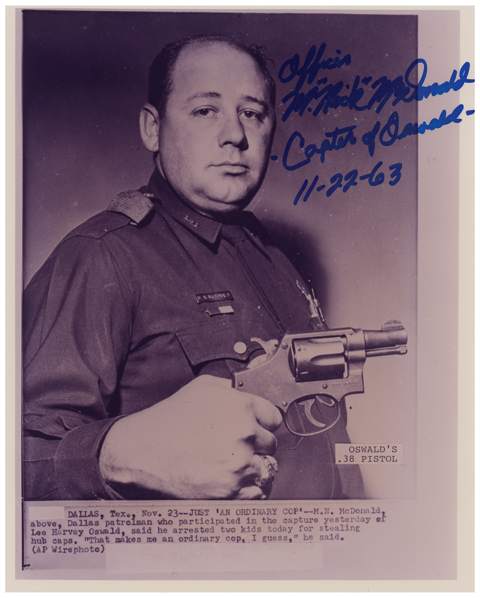 Dallas patrolman (1928-2005) who captured Lee Harvey Oswald after the assassination of John F. Kennedy on November 22, 1963. Glossy 8 x 10 reprint photo of a press photo showing McDonald holding up Oswald's .38 pistol, signed in blue felt tip, "Officer M. 'Nick' McDonald, Captor of Oswald, 11-22-63." In very fine condition.