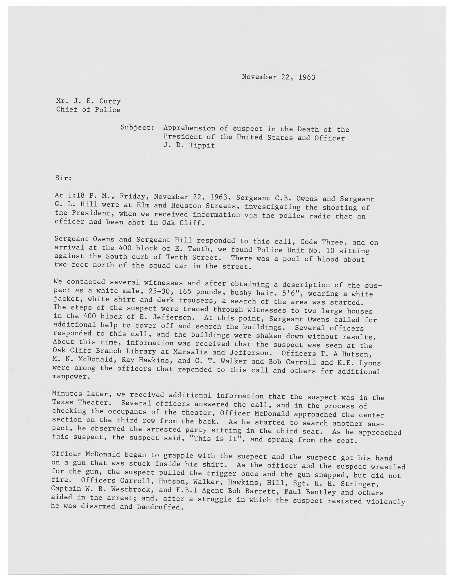 Souvenir typescript of the statement made by the arresting officers of Lee Harvey Oswald and submitted to Police Chief J. E. Curry, two pages, 8.5 x 11, signed at the conclusion in blue ballpoint by Gerald L. Hill, Ray Hawkins, Paul Bentley, and M. Nick McDonald. In part: "At 1:18 P.M. Friday, November 22, 1963?investigating the shooting of the President, when we received information via the police radio that an officer had been shot?There was a pool of blood about two feet north of the squad car in the street?Minutes later we received additional information that the subject was in the Texas Theater [sic]?Officer McDonald approached the center section on the third row from the back?As he approached the subject, the suspect said, 'This is it,' and sprang from his seat?.after a struggle in which the suspect resisted violently he was disarmed and handcuffed?The suspect, later identified as Lee H. Oswald, w/m/24, was released by arresting officers to Captain J.W. Fritz of the Homicide Bureau." In fine condition. Accompanied by a small biographical card signed in blue felt tip by McDonald.