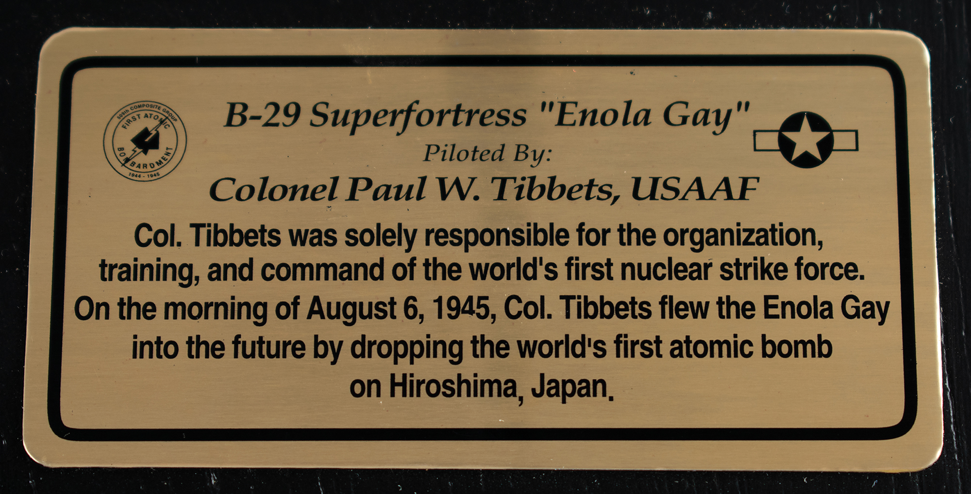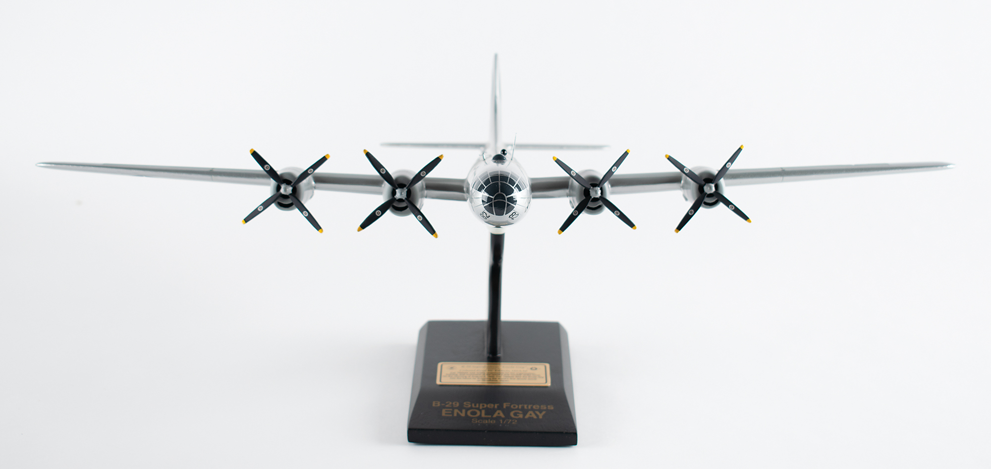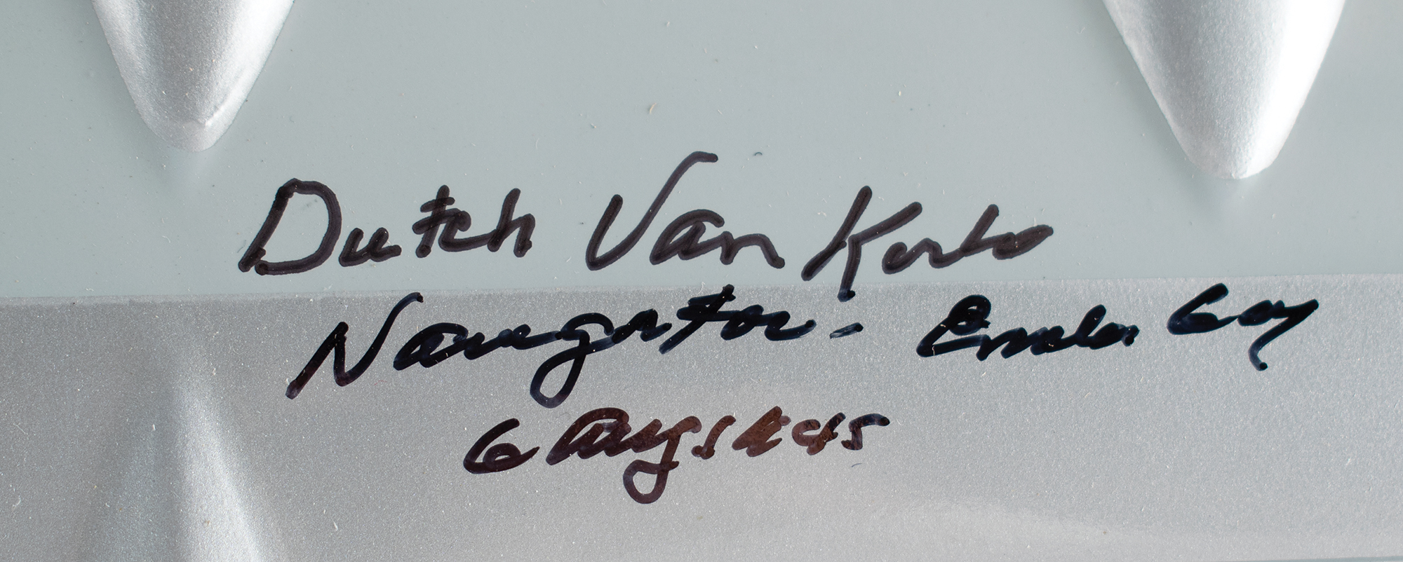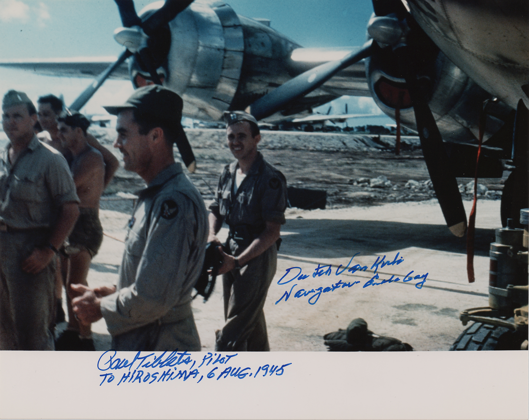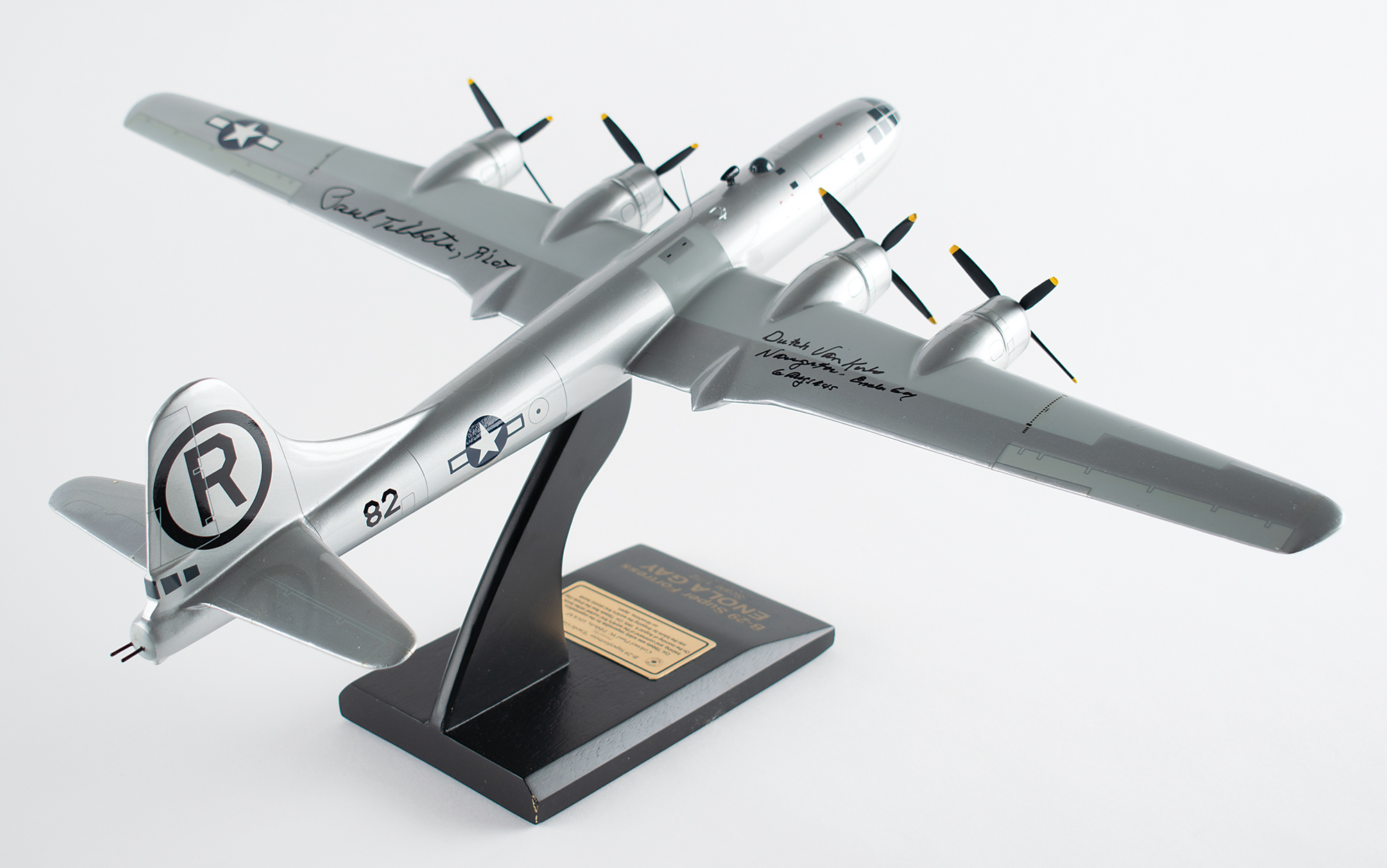 Fantastic 1:72 scale model of the B-29 Superfortress 'Enola Gay,' measuring 16″ long with a 24″ wingspan, signed on the wings in black felt tip, "Paul Tibbets, Pilots" and "Dutch Van Kirk, Navigator—Enola Gay, 6 Aug. 1945." Complete with its original stand. In fine condition. Accompanied by a color glossy 10 x 8 photo of the two on the ground, signed in blue felt tip, "Paul Tibbets, Pilot, To Hiroshima, 6 Aug. 1945," and "Dutch Van Kirk, Navigator—Enola Gay."