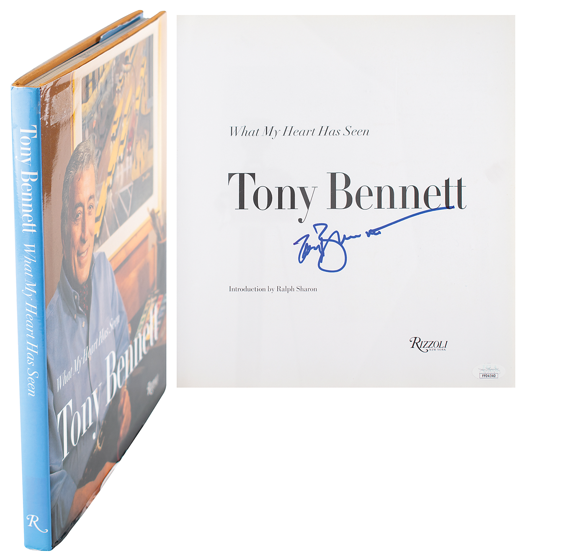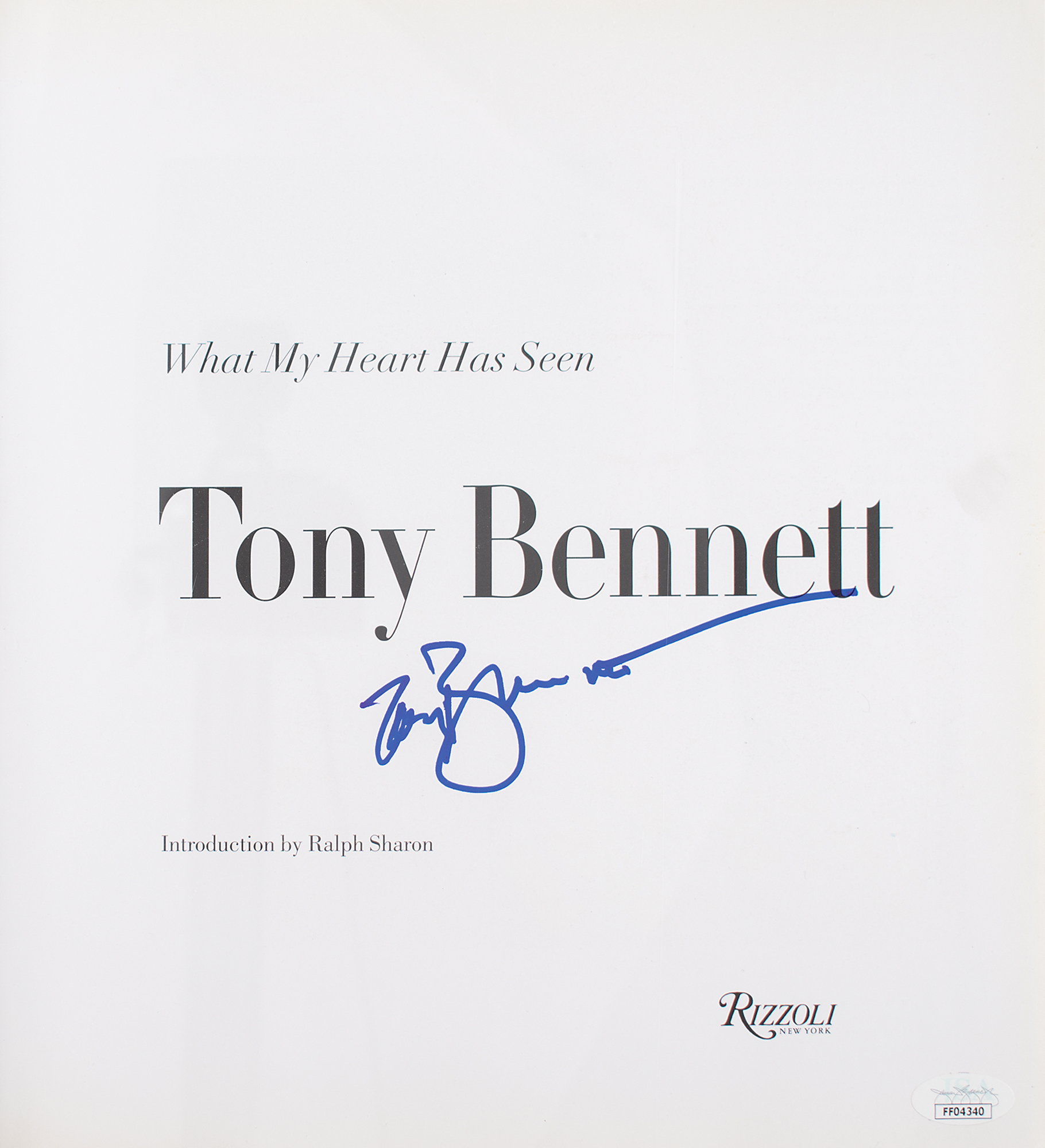 Signed book: What My Heart Has Seen. NY: Rizzoli, 1996. Hardcover with dust jacket, 10.25 x 11.25, 152 pages. Signed on the title page in blue felt tip by Tony Bennett. In fine condition, with some old sticker residue on the dust jacket, and a JSA label affixed to signed page (certificate not present).