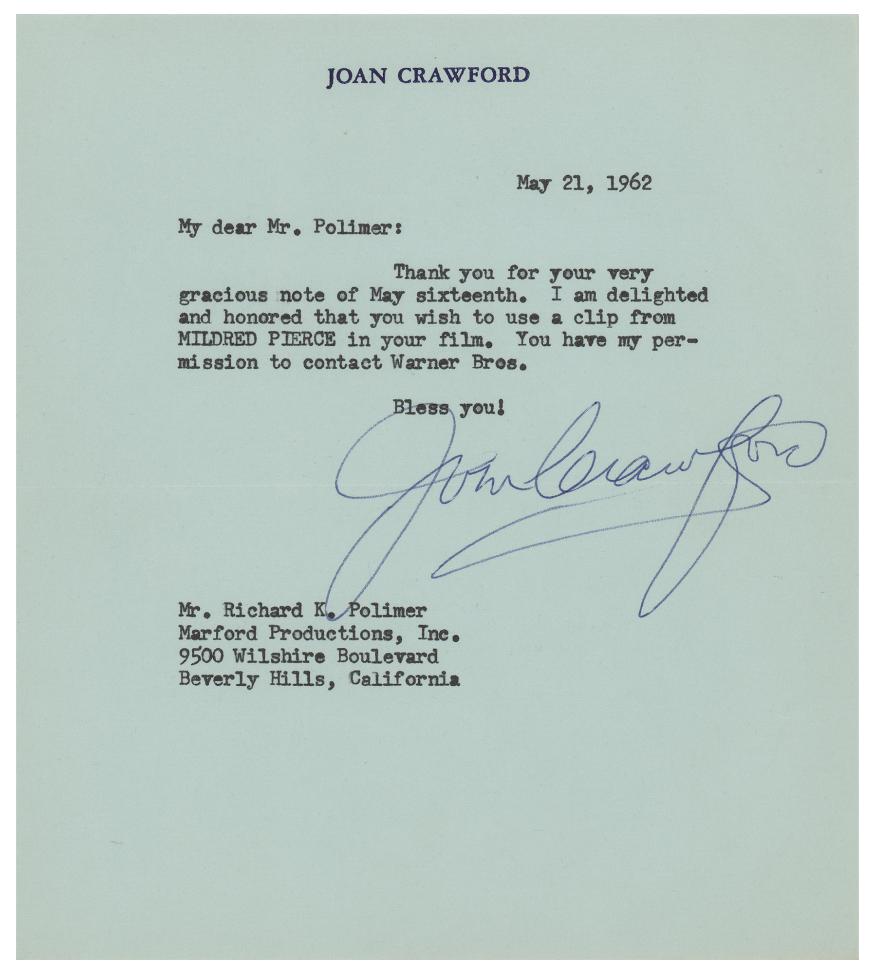 TLS, one page, 6.25 x 7, personal letterhead, May 21, 1962. Letter to Richard K. Polimer of Marford Productions, in full: "Thank you for your very gracious note of May sixteenth. I am delighted and honored that you wish to use a clip from MILDRED PIERCE in your film. You have my permission to contact Warner Bros." In fine condition.