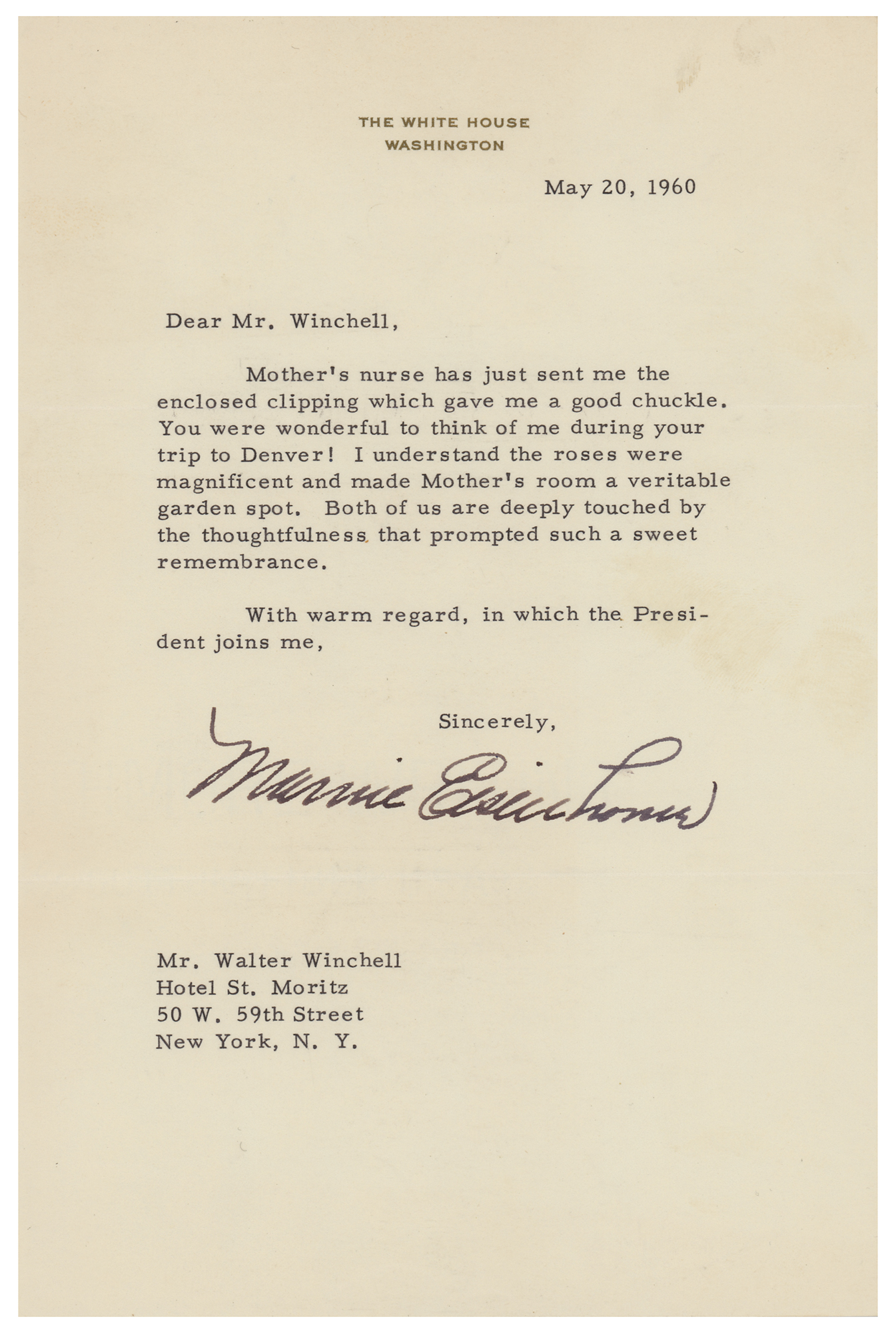 TLS as first lady, one page, 6.25 x 9.25, White House letterhead, May 20, 1960. Letter to newspaper gossip columnist and radio news commentator Walter Winchell, in full: "Mother's nurse has just sent me the enclosed clipping which gave me a good chuckle. You were wonderful to think of me during your trip to Denver! I understand the roses were magnificent and made Mother's room a veritable garden spot. Both of us are deeply touched by the thoughtfulness that promoted such a sweet remembrance. With warm regard, in which the President joins me." In fine condition, with two small stains to the upper right corner.