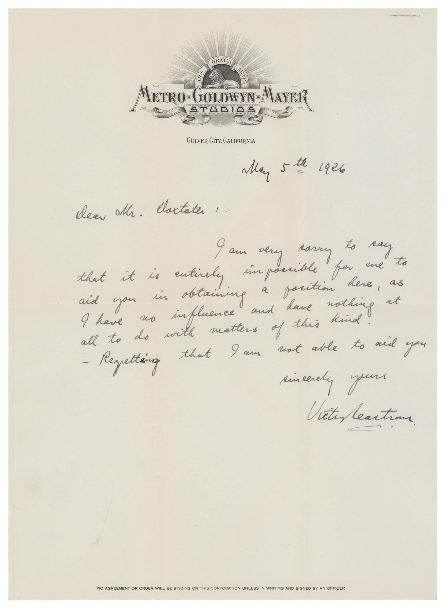 Swedish film director, screenwriter, and actor (1879-1960) who began his career in Sweden before moving to Hollywood in 1924. Sweden's most prominent director in the ‘Golden Age of Silent Film’ in Europe, Sjostrom is perhaps best known for his influential 1921 fantasy film The Phantom Carriage. Rare ALS signed with his American name, "Victor Seastrom," one page, 8.5 x 11, MGM Studios letterhead, May 5, 1926. Handwritten letter to Mr. Doxtater, in full: "I am very sorry to say that it is entirely impossible for me to aid you in obtaining a position here, as I have no influence and have nothing at all to do with matters of this kind. Regretting that I am not able to aid you." In fine condition. Sjostrom is quite rare across all signed formats, with this being just the second signature we have ever offered.