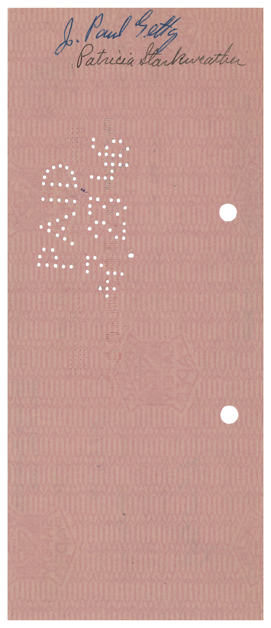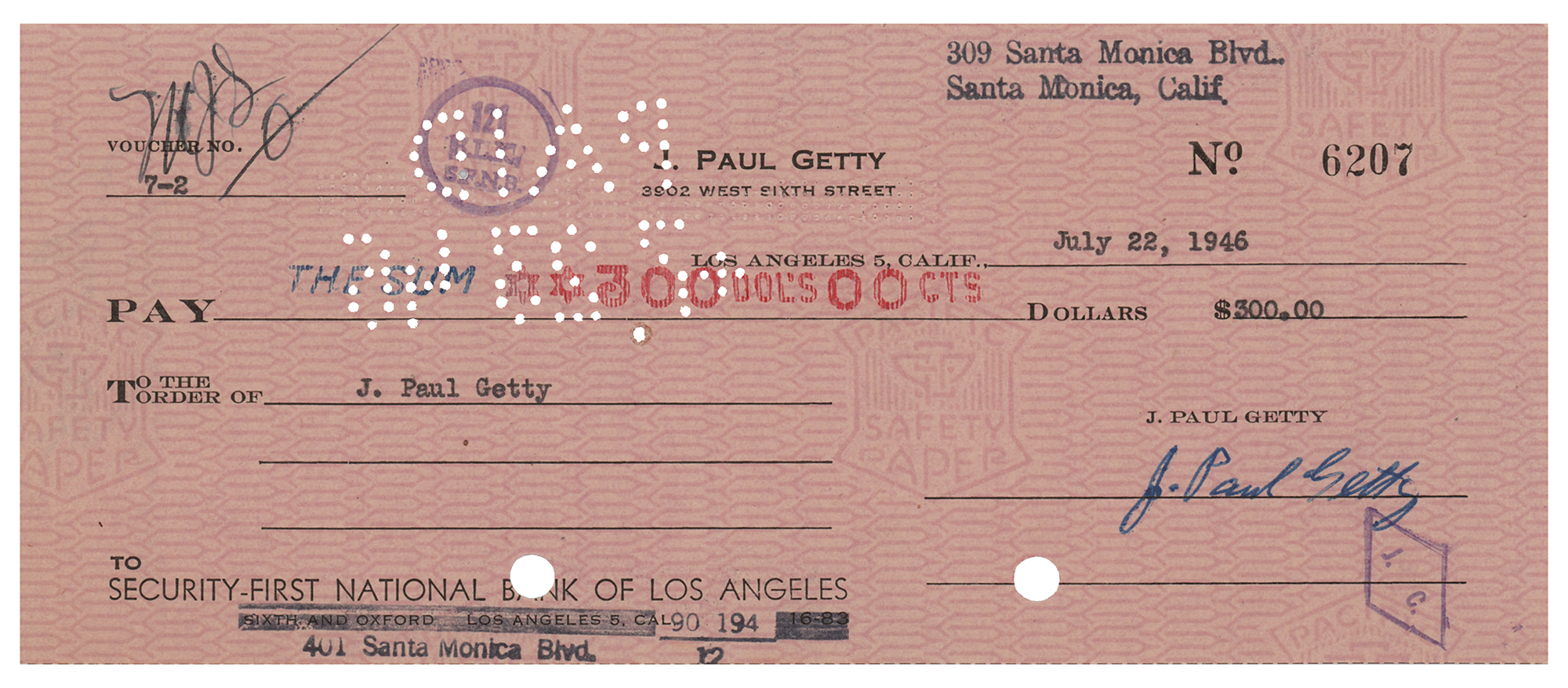 Personal check, 8.5 x 3.5, filled out in type and signed by J. Paul Getty, payable to himself for $300, July 22, 1946. Endorsed on the reverse by Getty in blue ink. In fine condition.