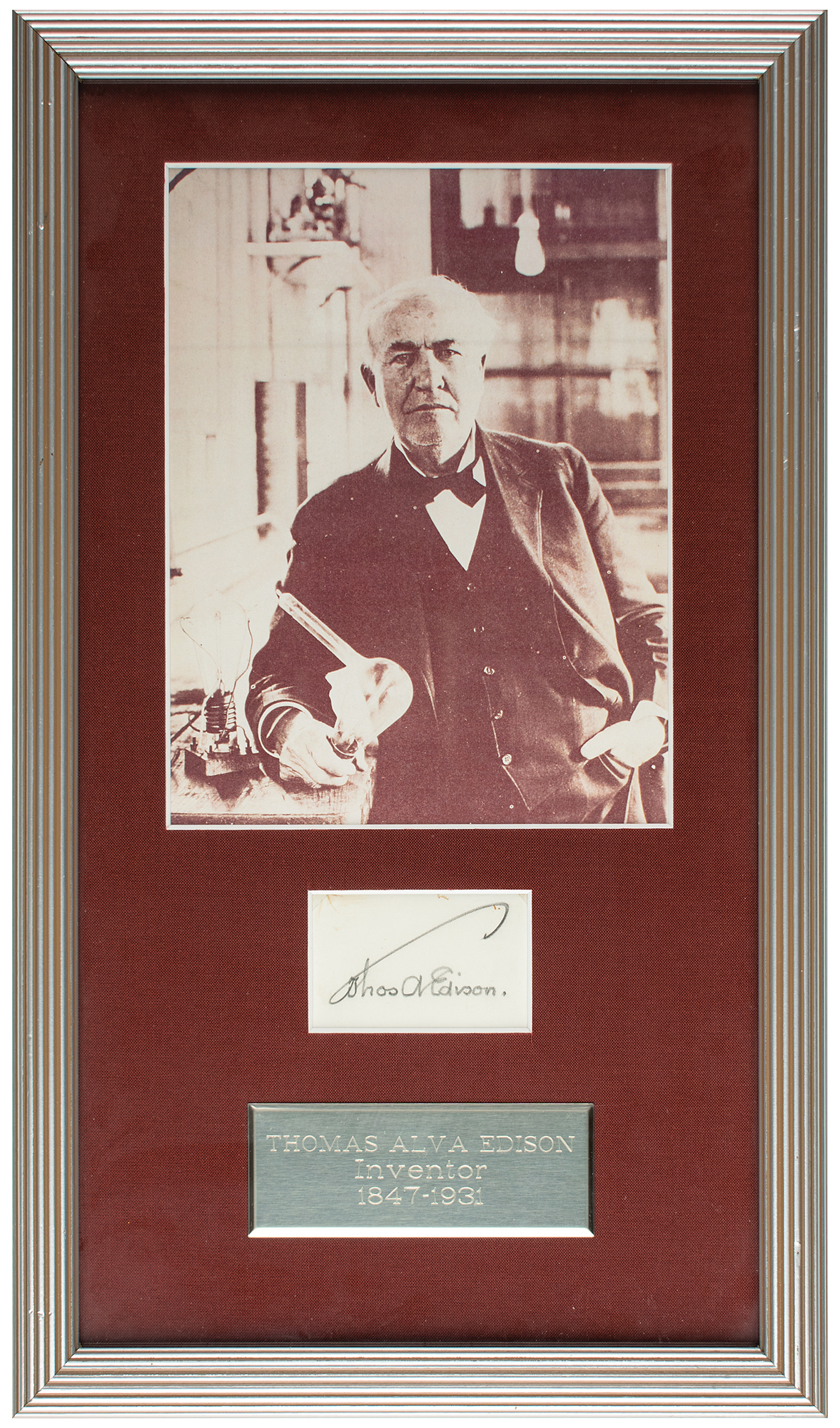 Pencil 'umbrella' signature, "Thos A. Edison,” on an off-white 2.5 x 1.5 sheet. Matted and framed with a photo and an engraved plate to an overall size of 9.5 x 16. In fine condition, with some small rust stains to the top edge.