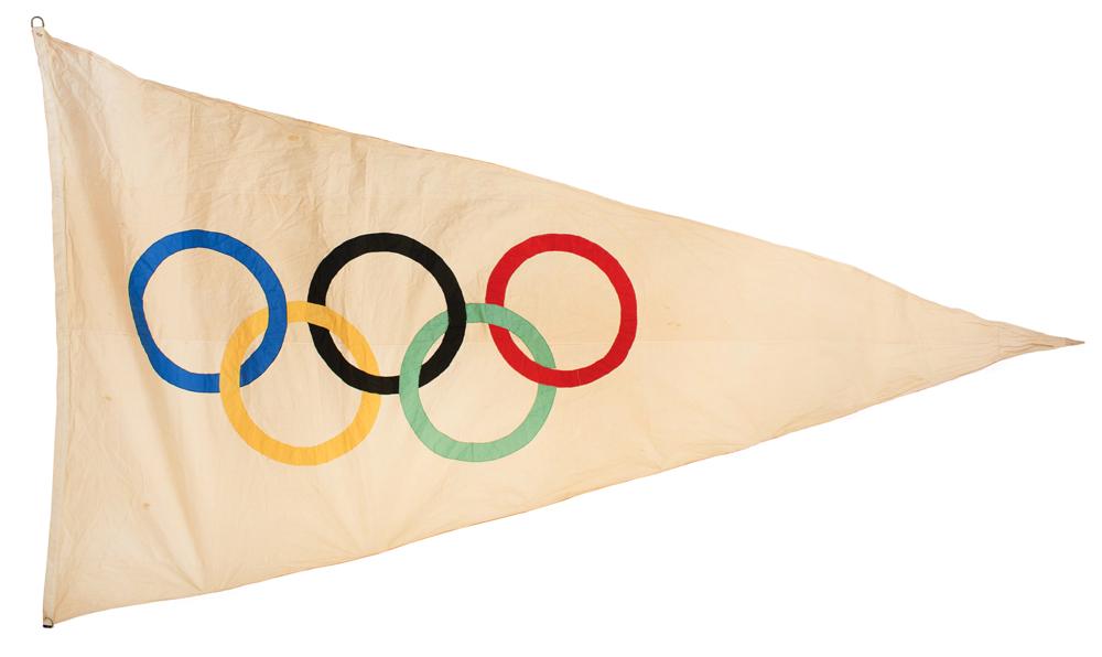 Massive fabric Olympic pennon flag that was flown during the Los Angeles 1932 Summer Olympics, measuring 178″ in length (roughly 15´) and 92″ in width (7 ½´), with both sides prominently displaying the blue, yellow, black, green, and red Olympic rings. In fine condition, with trivial wear from use and some scattered stains; this enormous flag is in excellent shape given its age of nearly 90 years.