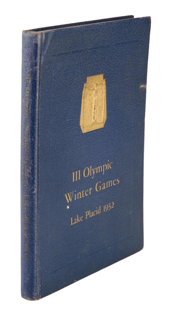 Scarce book: Official Report, III Winter Games, Lake Placid 1932. Issued by the III Olympic Winter Games Committee. Hardcover bound in original navy cloth with gilt titles and winner's medal emblem, 8 x 11, 209 pages. First free end page bears the ownership signature of Arthur N. Foxe, and his "The Skating Library" ink stamp. Book condition: VG/None, with some scuffing to boards and minor creasing to page extremities.