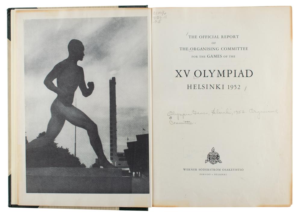 Rare book in the English language: The Official Report of the Organising Committee for the Games of the XV Olympiad, Helsinki 1952. Porvoo, Finland: Werner Soderstrom Osakeyhtio, 1955. Rebacked hardcover, 9 x 11.75, 758 pages. Book condition: VG-/None, with pencil annotations and some light tape stains to the title page, restorations to spine and boards, and some chips to the paper on the front board.
