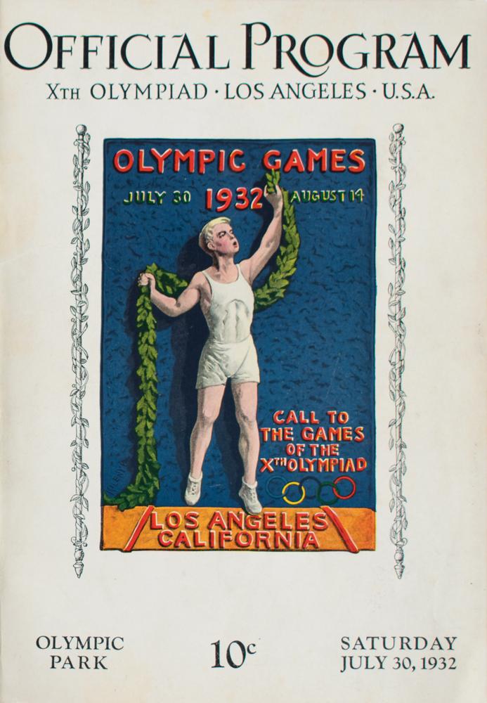 Fantastic complete bound set of the 39 official programs of the Los Angeles 1932 Summer Olympics. Hardcover bound in blue cloth with gilt lettering, "Complete Collection of the 39 Official Programs, Games of the Xth Olympiad, Los Angeles, U.S.A., 1932," 8 x 11, printed by the Times-Mirror Printing & Binding House, Los Angeles. Book condition: VG-/None, with cracked hinges, bumped and rubbed corners, and edgewear (especially to edges of spine).