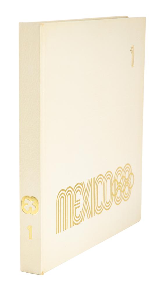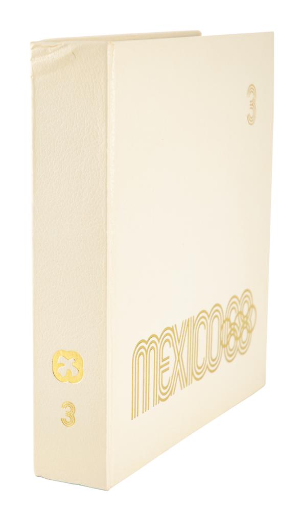 Rare four-volume set of books in English and French: Mexico 68: Official Report of the XIX Olympic Games, Volumes I-IV. Hardcovers bound in white leatherette with gilt titles, 11.75 x 11.75, totaling over 2300 pages. Each volume includes its original box; boxes for the second and fourth volumes are still sealed. In overall fine condition, with wear to the boxes.