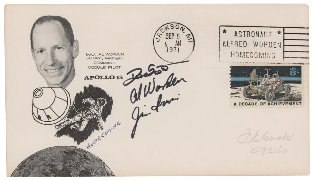 Al Worden's 'Homecoming' commemorative cover with a cachet honoring Worden as the CMP of the Apollo 15 mission, with an "Astronaut, Alfred Worden, Homecoming" stamp, postmarked at Jackson, Michigan, on September 5, 1971, signed in black felt tip by Dave Scott, Al Worden, and Jim Irwin. In fine condition.