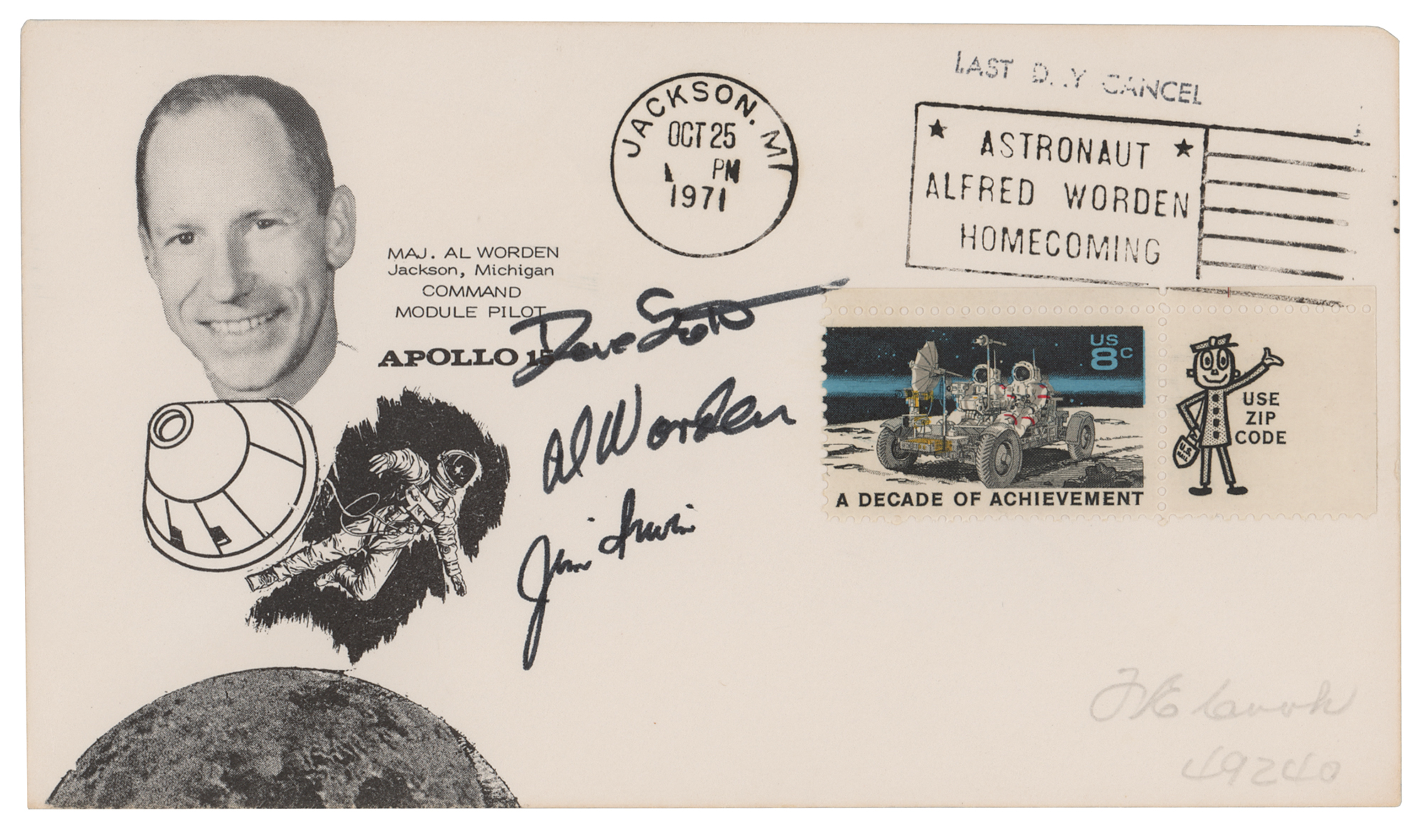 Al Worden's 'Homecoming' commemorative cover with a cachet honoring Worden as the CMP of the Apollo 15 mission, with an "Astronaut, Alfred Worden, Homecoming" stamp, postmarked at Jackson, Michigan, on October 25, 1971, signed in black felt tip by Dave Scott, Al Worden, and Jim Irwin. In fine condition.