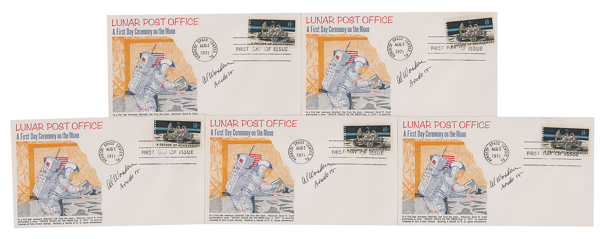 Al Worden’s group lot of five FDCs with color cachets honoring the “Lunar Post Office: A First Day Ceremony on the Moon,” each postmarked at the Kennedy Space Center on August 2, 1971, and signed in black ballpoint, “Al Worden, Apollo 15.” In overall fine condition.