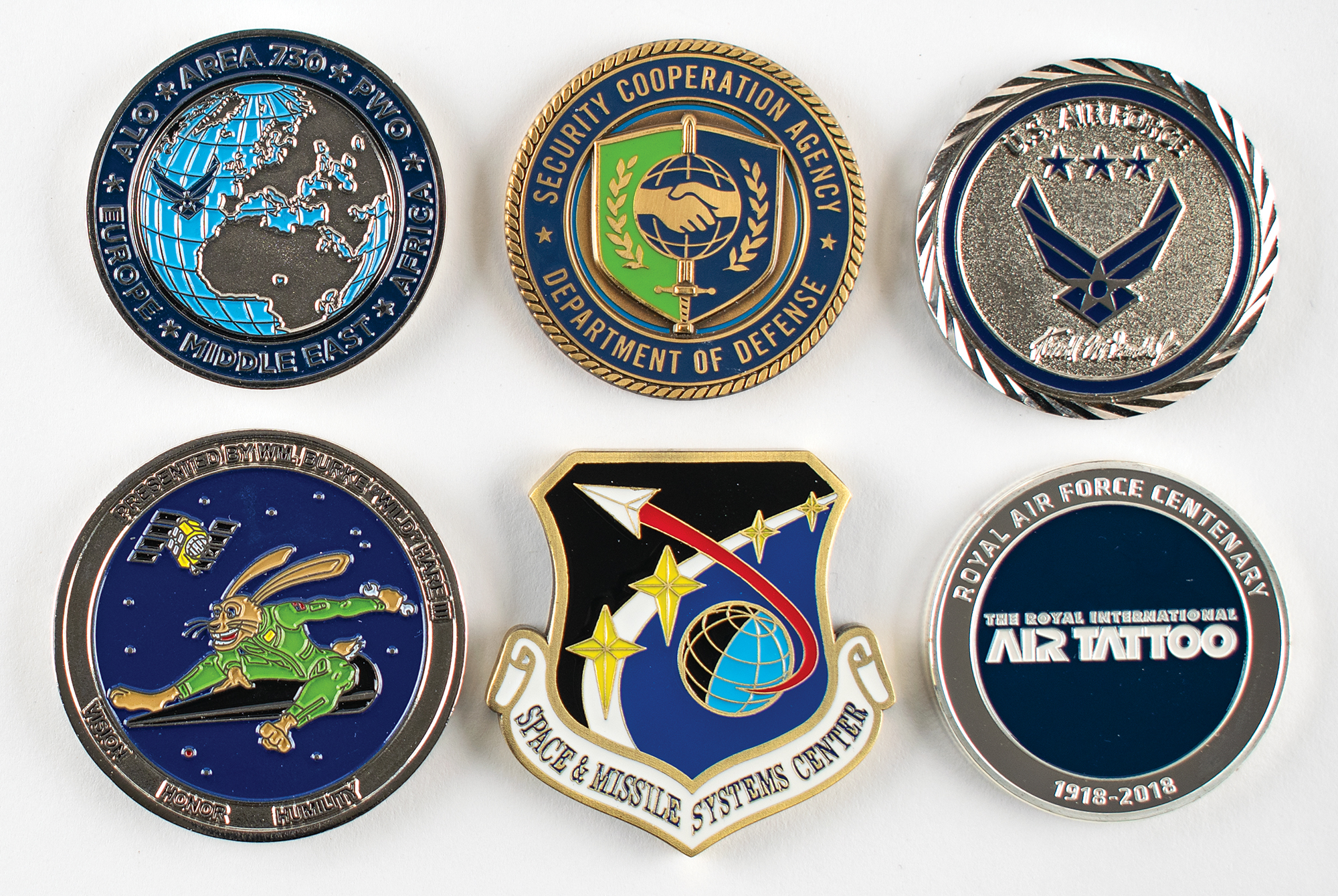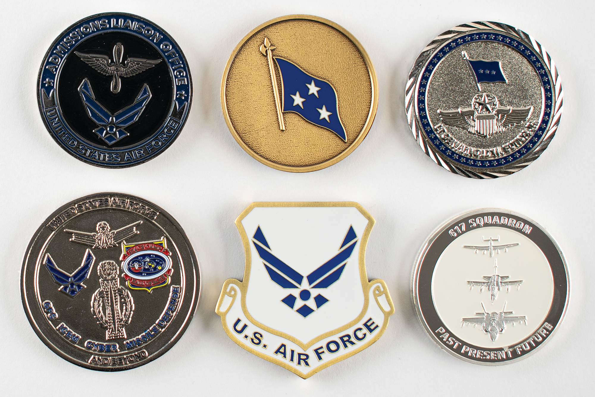 Al Worden’s lot of six United States Air Force medallions and ‘challenge coins,’ each 1.75″ or 2″ in diameter, with embossed color designs and text to both sides, including: a silver medallion honoring Lt. Gen. Arnold W. Bunch, Jr.; a bronze-tone medallion for the “Security Cooperation Agency, Department of Justice,” reverse bearing a three-star flag; a shield-shaped medallion honoring the U.S. Air Force and the Space & Missile Systems Center; an “Area 730, PWO” medallion for the Admission Liaison Office; a medallion honoring USAF defense systems, presented by William Burke ‘Wild’ Hare III; and a “617 Squadron” medallion honoring the Royal Air Force Centenary. In overall fine condition.