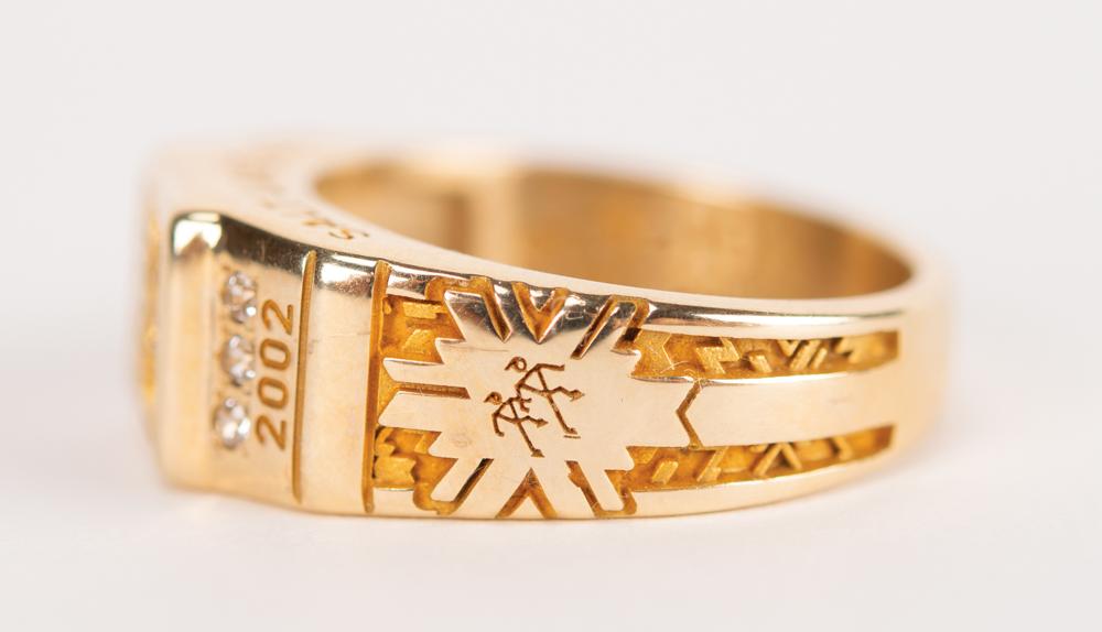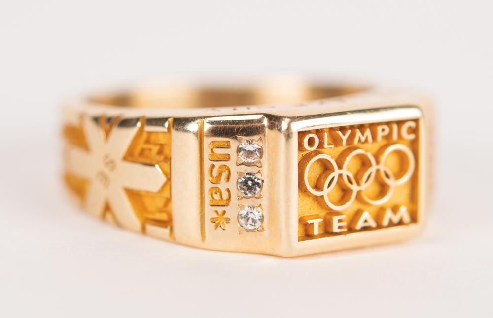 10K yellow gold ring presented to Team USA speed skating coach Sue Ellis at the Salt Lake City 2002 Winter Olympics. Made by O. C. Tanner, the ring, size 9.5, features the Olympic rings with text, “Olympic Team,” to the top, with the shoulders marked “2002” and “USA,” and both bearing three small diamonds. One shank shows the Salt Lake City Games logo with pictogram for the short track speed skating event, and the other is engraved with Ellis’s initials, “SE.” Both sides of the bridge are engraved: “Salt Lake City.” Includes the original ring case, which bears some wear, and the presentation box, with label to underside.