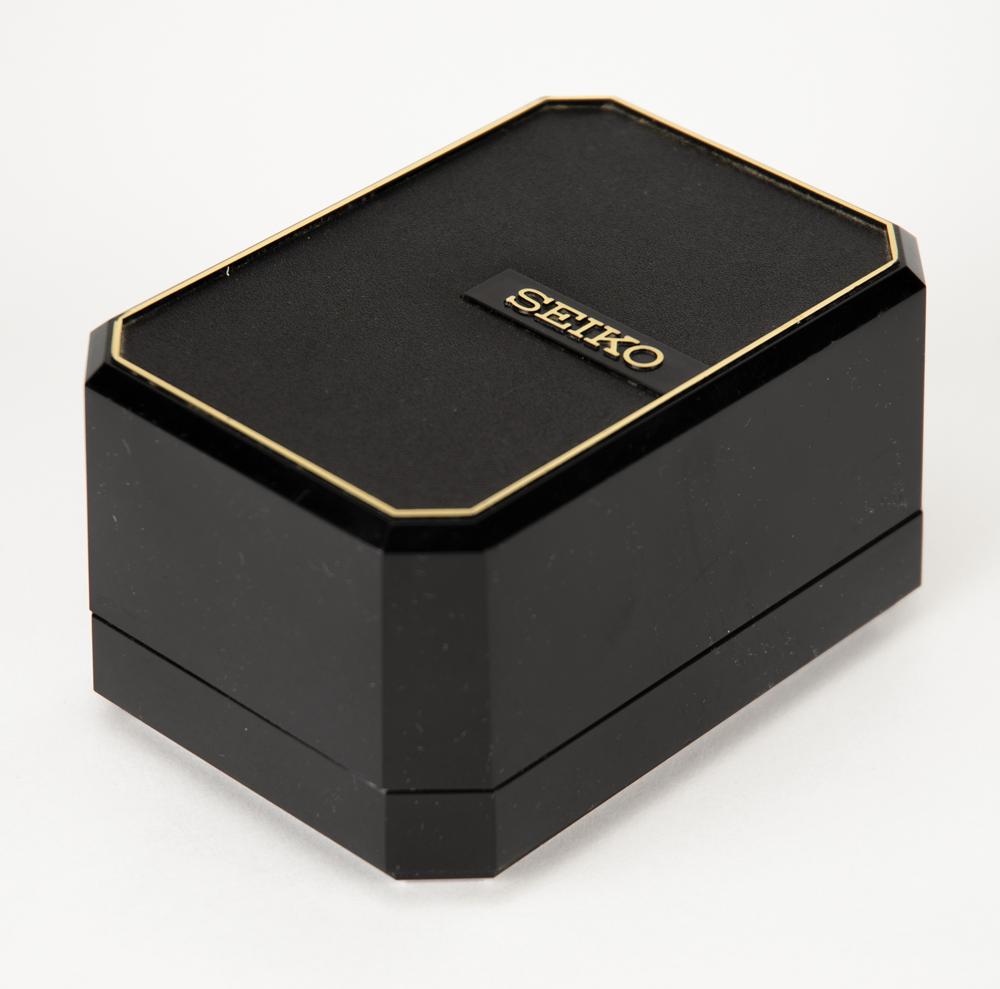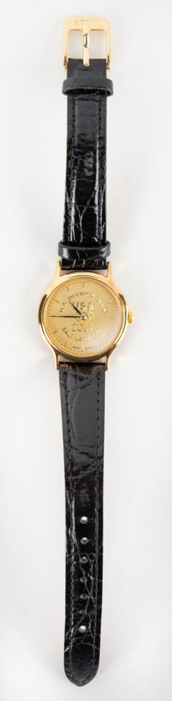 Very attractive Seiko wristwatch presented to members of Team USA at the Salt Lake City 2002 Winter Olympics. The quartz movement watch features a gold-tone case with matching dial that features the Olympic rings to center with surrounding text: “U.S. Olympic Team, USA 2002, Salt Lake City.” Includes a black calfskin strap. Accompanied by the original Seiko case.
