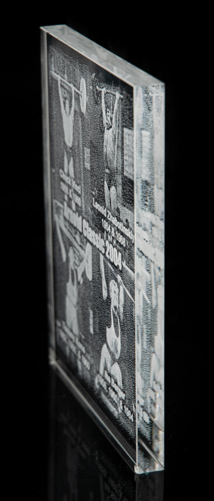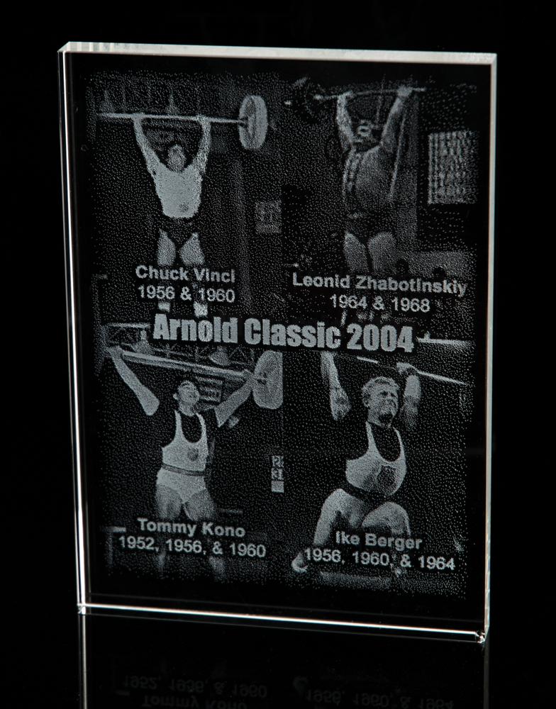 Rare Memorial Award presented by Arnold Schwarzenegger to legendary Ukrainian weightlifter Leonid Zhabotinsky at the 2004 Arnold Classics in Columbus, Ohio, on March 6, 2004. The rectangular crystal award, 5″ x 7″ x .5″, features 3D engraved images of Zhabotinsky and three other gold medal-winning Olympic weightlifters honored at the event: Chuck Vinci, Tommy Kono, and Ike Berger.