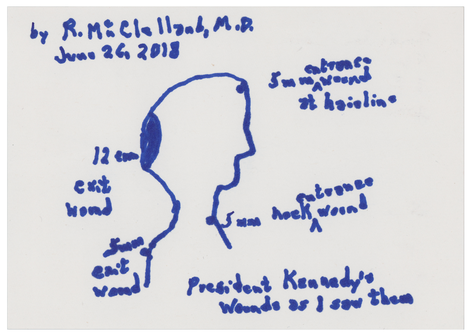 Surgeon at Parkland Hospital who attended to President Kennedy after he was shot on November 22, 1963. Original felt tip sketch of "President Kennedy's Wounds as I saw them" on a white 5.75 x 4 sheet, signed "by R. McClelland, M.D., June 26, 2018." The sketch shows President Kennedy's head in profile, with the entry and exit wounds labeled on the head and neck. In fine condition. Accompanied by the original mailing envelope.