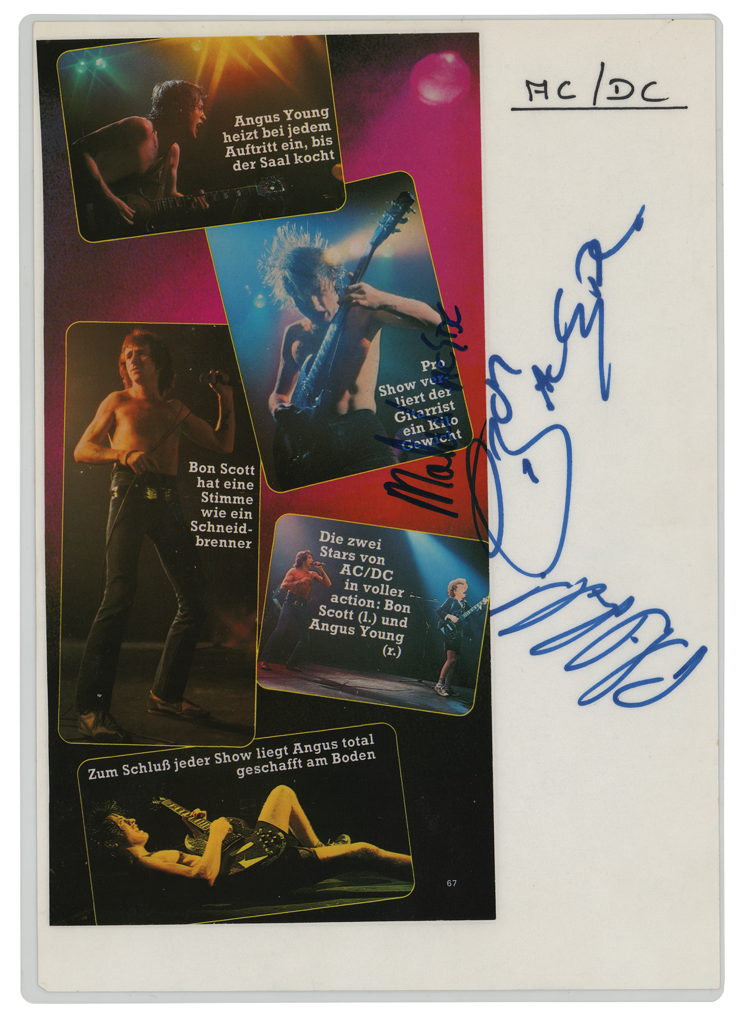 Laminated blue felt tip signatures of AC/DC members Bon Scott, Phil Rudd, and Malcolm Young on an off-white 8.25 x 11.75 sheet with an affixed magazine photo. In fine condition.