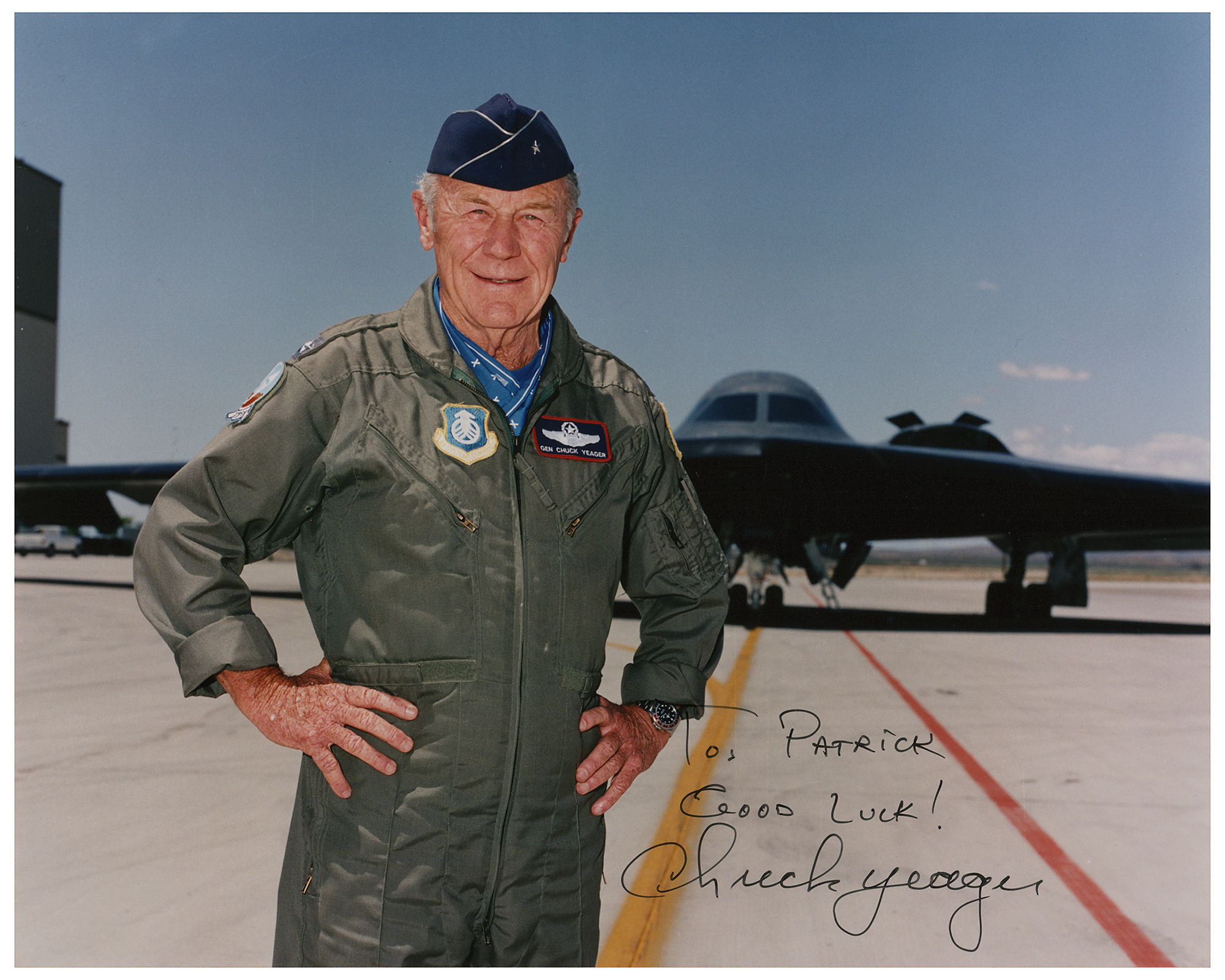 Color glossy 10 x 8 photo of Yeager posing in front of a B-2 stealth bomber, signed and inscribed in black ink, "To Patrick, Good luck! Chuck Yeager.” Reverse bears a "Northrop Grumman Photo" label. In fine condition, with a few small surface creases.
