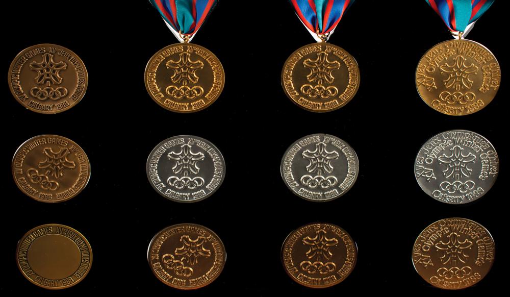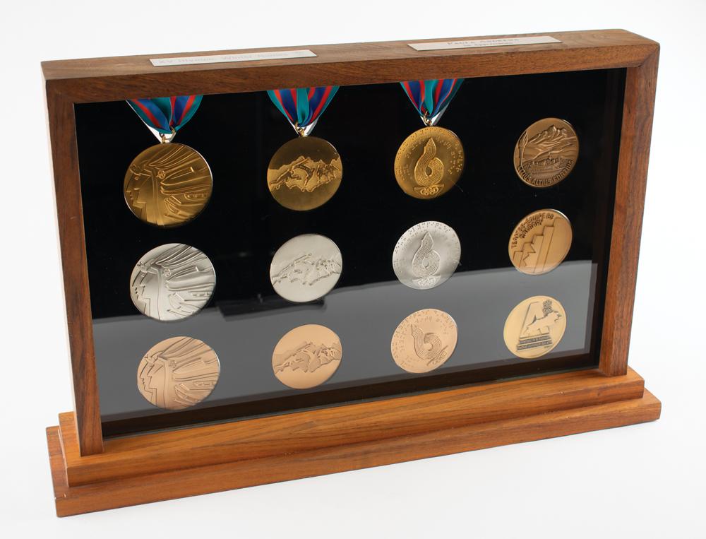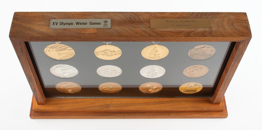 Extraordinary and rare example of a set of medals from the Calgary 1988 Winter Olympics, which were presented to Paula Andrews, the mayor of the Olympic Village and a member of the Calgary Winter Olympic Organizing Committee (OCO ’88) Board of Directors. The set features a total of twelve medals: gold, silver, and bronze winner's medals for the official Olympic events, the Olympic demonstration sports, and the disabled skiing exhibition event; as well as bronze participation medals for the Olympics, the Team ’88 Volunteers, and the Olympic Arts Festival. The medals are presented in a dual-paned wooden display case prepared by the mint (Jostens, Inc.), measuring an overall 21.75″ x 13.75″ x 4.75″, with plaques affixed to the top, "XV Olympic Winter Games" and "Paula Andrews, In Appreciation.”