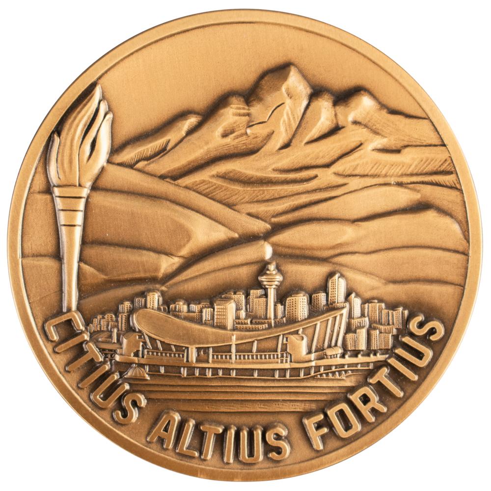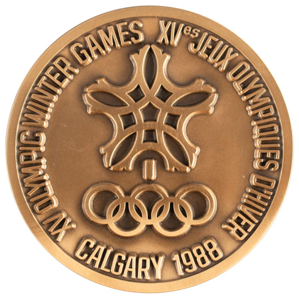 Participation medal issued for the Calgary 1988 Winter Olympics and presented to Paula Andrews, the mayor of the Olympic Village and a member of the Calgary Winter Olympic Organizing Committee (OCO ’88) Board of Directors. Bronze, 64 mm, 133 gm, by Cornelius Martens. The front depicts the Calgary Games emblem and raised French and English text, “Calgary 1988, XV Olympic Winter Games”; the reverse bears a panoramic view of Calgary, the Saddledome Stadium, and the Canadian Rocky Mountains, with the Olympic motto below. Includes its original velvet case.