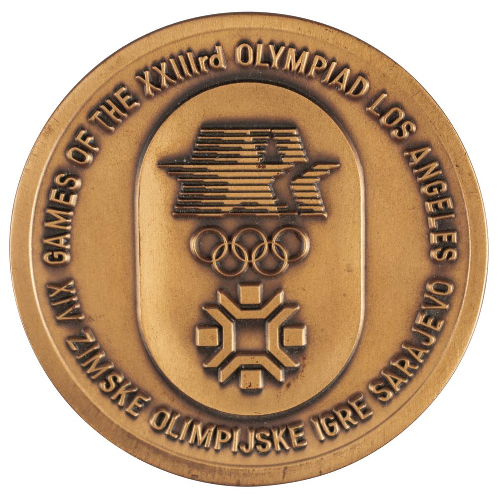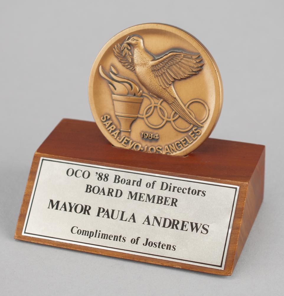 Scarce medal honoring the 1984 Summer and Winter Olympic Games held in Los Angeles and Sarajevo, presented by the Calgary Winter Olympic Organizing Committee (OCO ‘88) Board of Directors to board member Paula Andrews, who served as the mayor of the Olympic Village. Bronze, 108 gm, 63 mm, made by Jostens. The front shows a dove with olive branch in its beak flying over the Olympic rings, a lit torch, and raise text: “1984, Sarajevo-Los Angeles”; the reverse bears the logos of the Summer and Winter Olympics with encircling text: “Games of the XXIIIrd Olympiads Los Angeles / XIV Zimske Olimpijske Igre Sarajevo.” Includes its original wooden presentation stand.