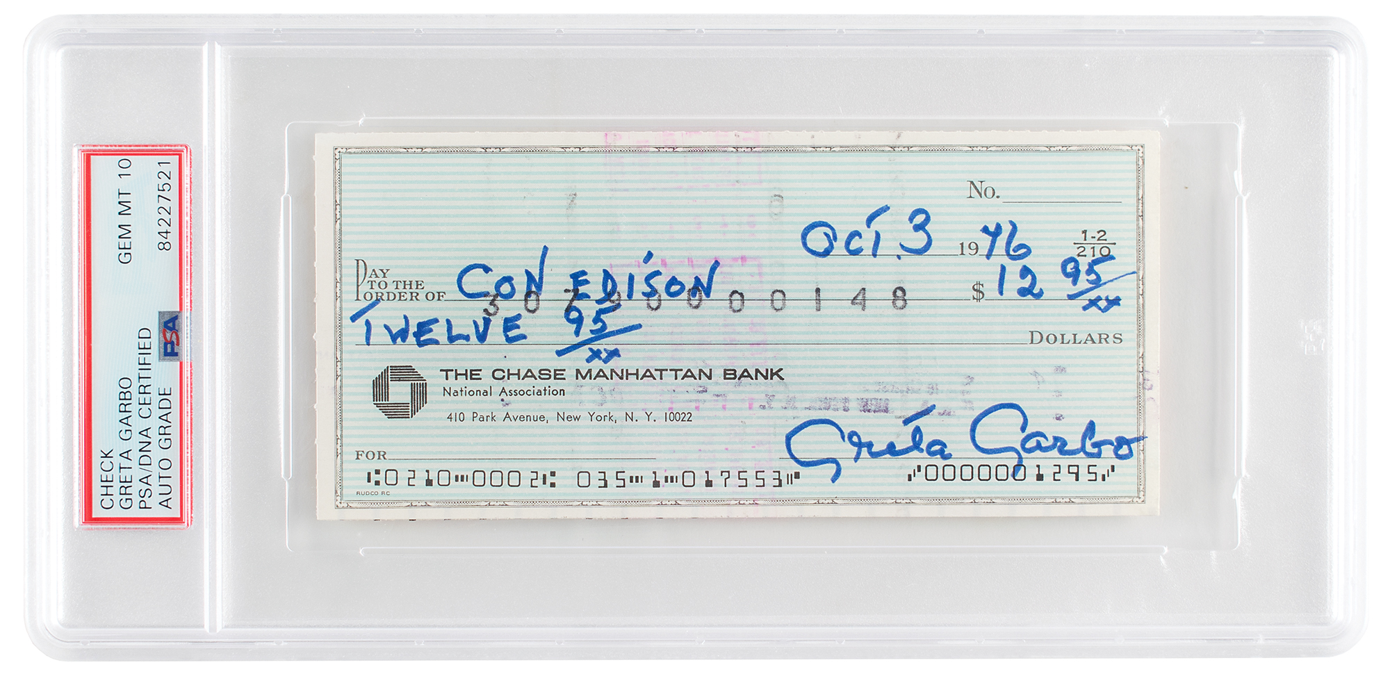 Chase Manhattan Bank check, 6 x 2.75, filled out and signed in blue felt tip by Greta Garbo, payable to Con Edison for $12.95, October 3, 1976. In fine condition. Encapsulated in a PSA/DNA authentication holder, grading the autograph as "GEM MT 10."