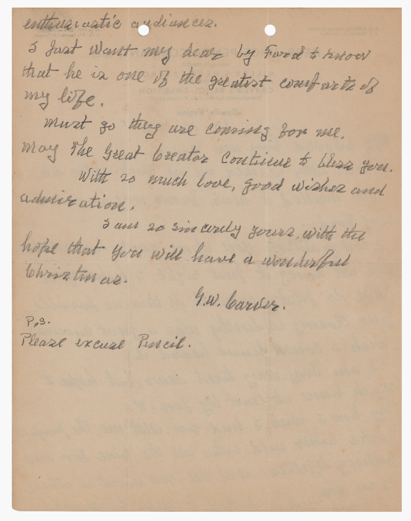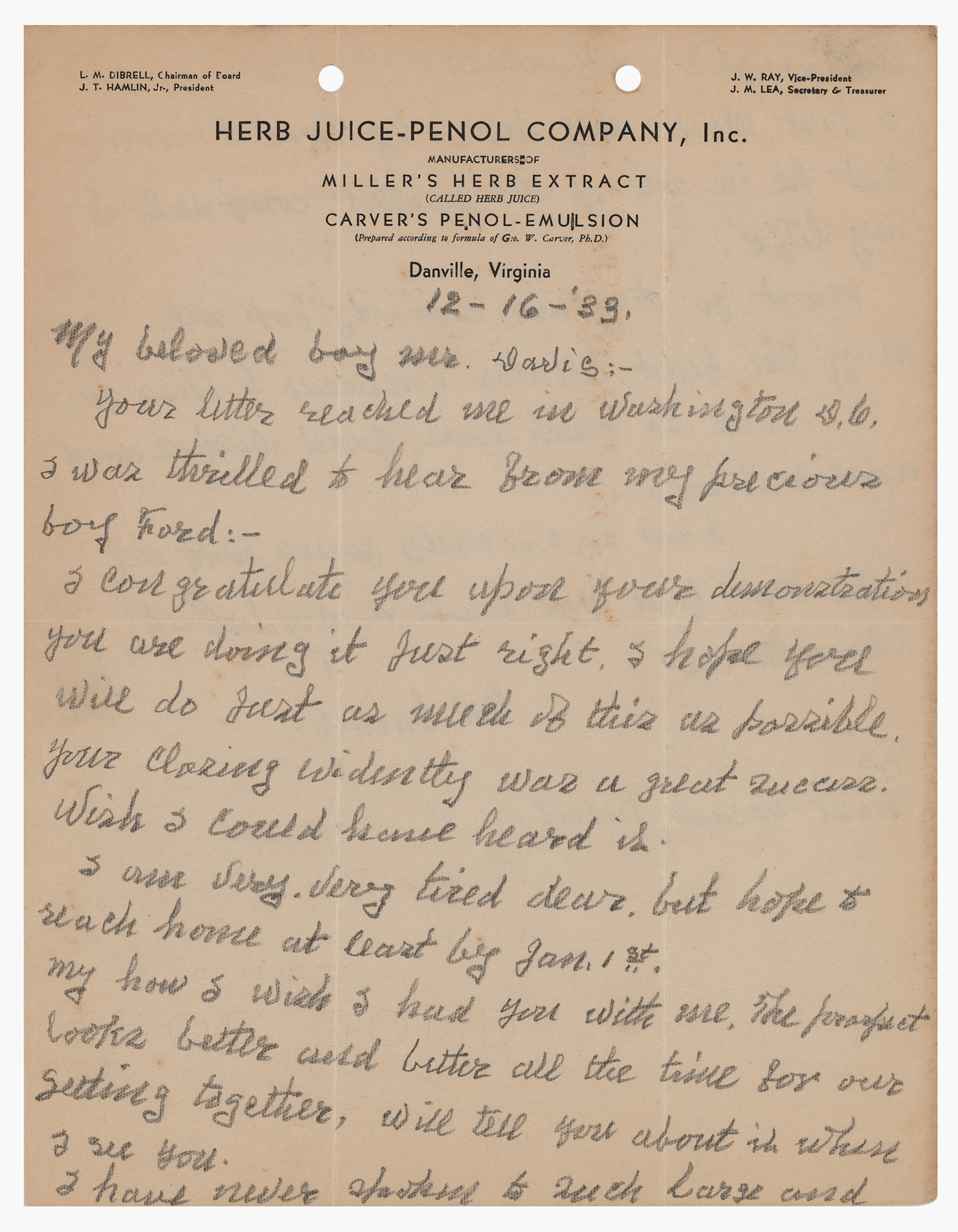 ALS in pencil signed “G. W. Carver,” one page both sides, 8.5 x 11, Herb Juice-Penol Company, Inc. letterhead, December 16, 1933. Handwritten letter to his white botany student Ford Davis, who became his close friend, and to whom he refers to here as "My beloved boy Mr. Davis," in full: "Your letter reached me in Washington D.C. I was thrilled to hear from my precious boy Ford:— I congratulate you upon your demonstration, you are doing it just right. I hope you will do just as much of this as possible. Your closing evidently was a great success. Wish I could have heard it. I am very, very tired dear, but hope to reach home at least by Jan. 1st. My how I wish I had you with me. The prospect looks better and better all the time for our getting together, will tell you about it when I see you. I have never spoken to such large and enthusiastic audience. I just want my dear boy Ford to know that he is one of the greatest comforts of my life. Must go they are coming for me. May the great Creator continue to bless you. With so much love, good wishes and admiration. I am so sincerely yours, with the hope that you will have a wonderful Christmas." With a brief postscript: "Please excuse pencil." In fine condition.