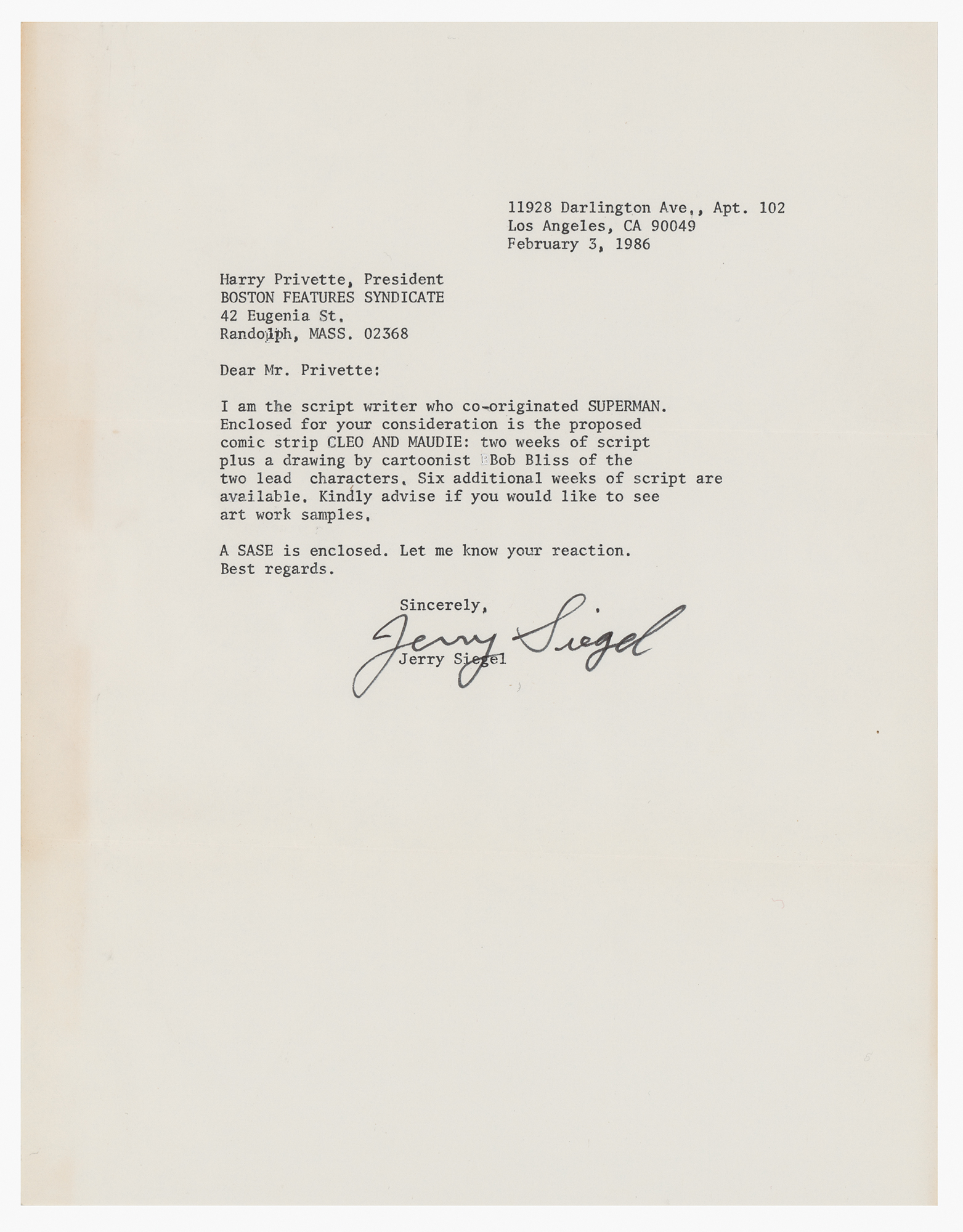 TLS, one page, 8.5 x 11, February 3, 1986. Letter to Harry Privette of the Boston Features Syndicate, in full: "I am the script writer who co-originated SUPERMAN. Enclosed for your consideration is the proposed comic strip CLEO AND MAUDIE: two weeks of script plus a drawing by cartoonist Bob Bliss of the two lead characters. Six additional weeks of script are available. Kindly advise if you would like to see art work samples. A SASE is enclosed. Let me know your reaction. Best regards." In fine condition, with light edge toning.