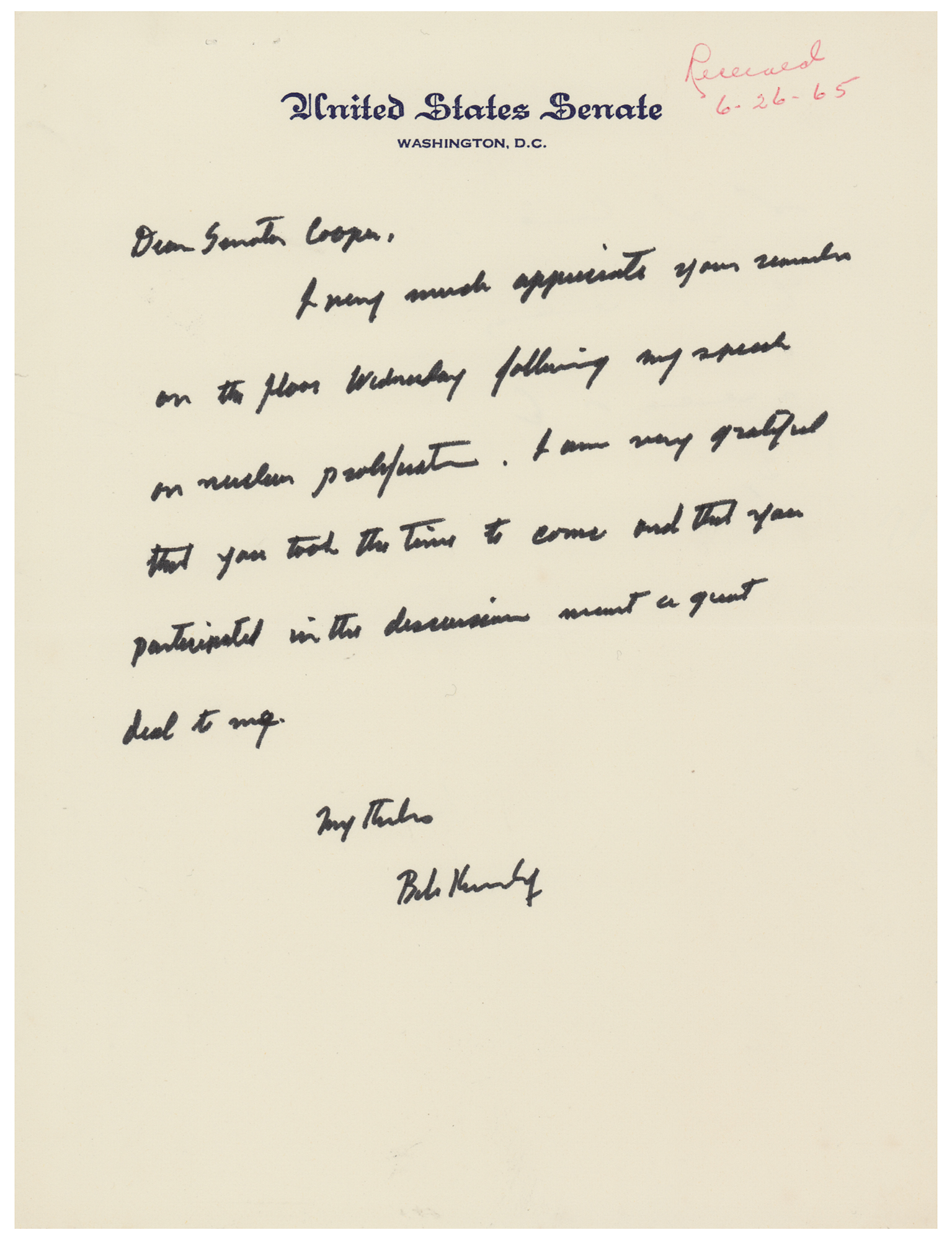 ALS signed “Bob Kennedy,” one page, 6 x 8, United States Senate letterhead, no date but annotated as received on June 26, 1965. Handwritten letter to Senator John S. Cooper of Kentucky, in full: "I very much appreciate your remarks on the floor Wednesday following my speech on nuclear proliferation. I am very grateful that you took the time to come and that you participated in the discussion meant a great deal to me." In fine condition.
