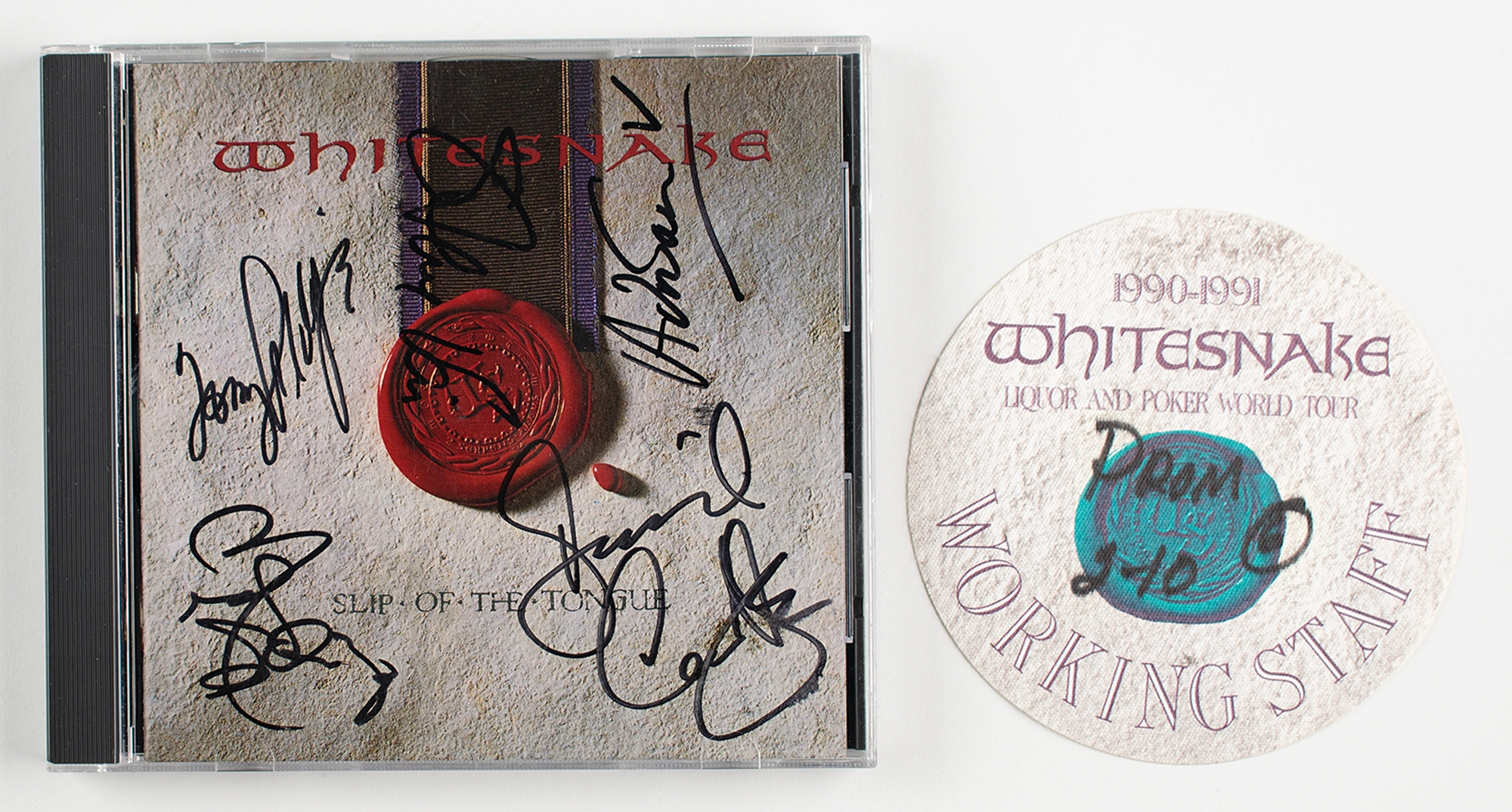 Slip of the Tongue CD by Whitesnake, signed on the front cover in black felt tip by David Coverdale, Steve Vai, Rudy Sarzo, Tommy Aldridge, and Adrian Vandenberg. In fine condition. The CD is included. Accompanied by an unused 'working staff' pass for a Whitesnake concert at the New Haven Veterans Memorial Coliseum in New Haven, Connecticut, on February 10, 1990, the date these autographs were obtained.