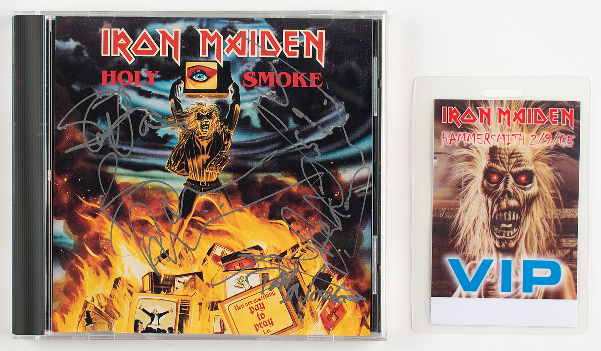 Holy Smoke CD single by Iron Maiden, signed on the front cover in silver ink by Bruce Dickinson, Steve Harris, Janick Gers, Dave Murray, and Nicko McBrain. In fine condition. The CD is included. Accompanied by a laminated VIP backstage pass for an Iron Maiden concert at London's Hammersmith Apollo on September 2, 2005, the date these autographs were obtained.