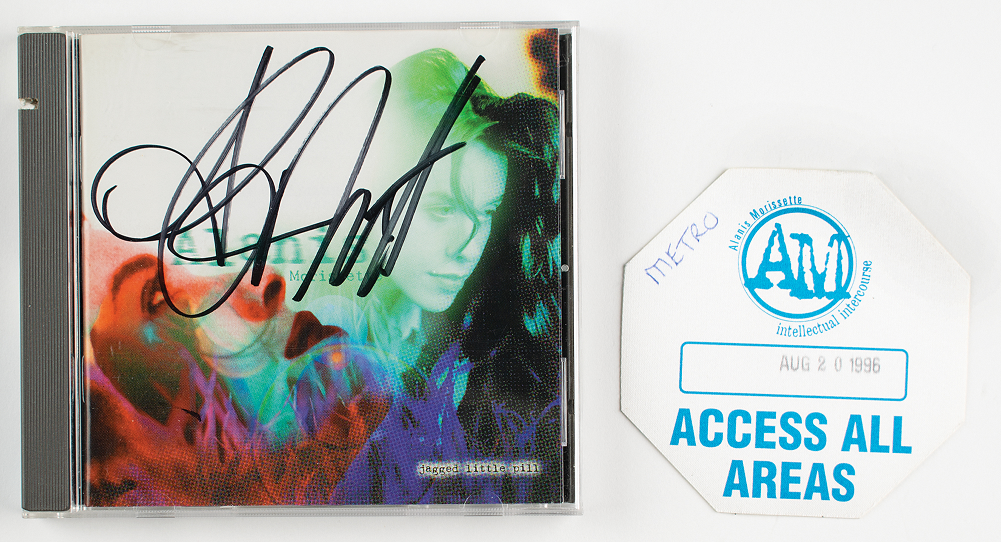 Jagged Little Pill CD by Alanis Morissette, who has signed the front cover in black felt tip. In fine condition. The CD is included. Accompanied by an unused 'access all areas' backstage pass for a Morissette concert at the Meadows Music Theater in Hartford, Connecticut, on August 20, 1996, the date the autograph was obtained.