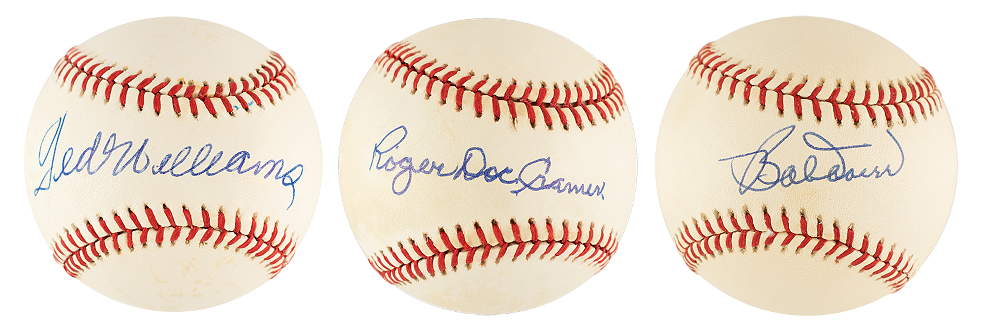 Three official Rawlings American League (Brown) baseballs, individually signed on the sweet spots in blue ballpoint, "Ted Williams," "Bob Doerr," and "Roger Doc Cramer." In very good to fine condition, with scattered spots of toning to side panels of the Williams ball, and mottled toning to side panels of the Cramer ball. The three were teammates on the 1939 and 1940 Boston Red Sox teams.