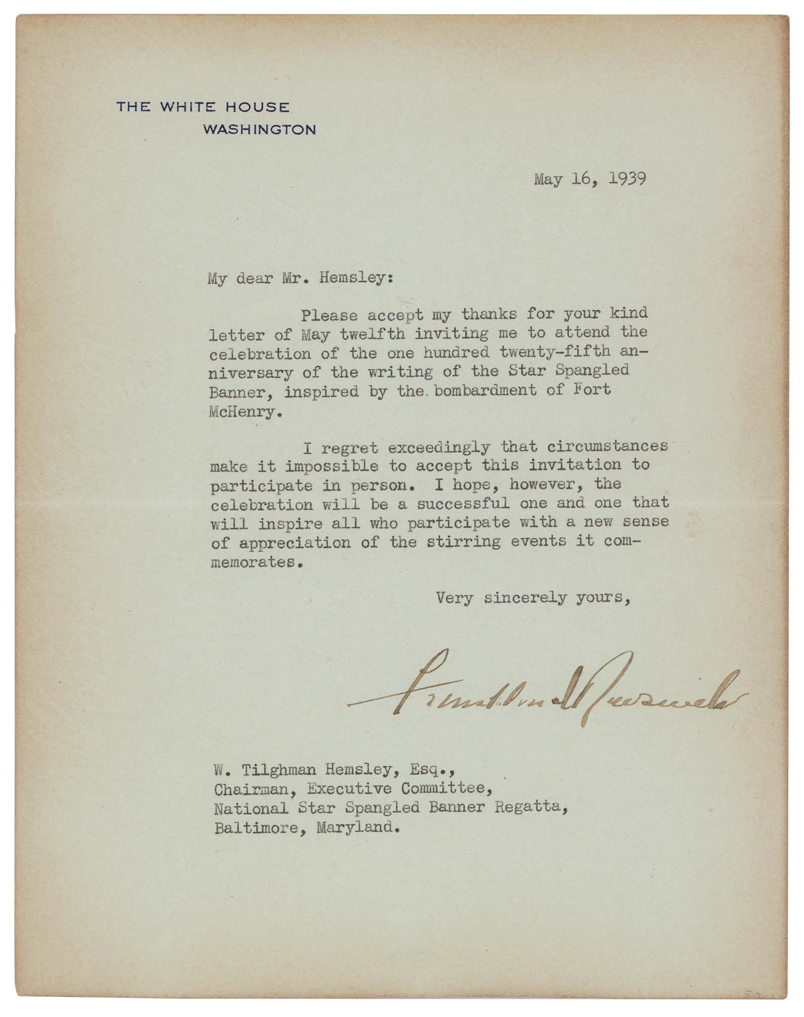 Important TLS as president, one page, 7 x 8.75, White House letterhead, May 16, 1939. Letter to W. Tilghman Hemsley, chairman of the executive committee of the Star Spangled Banner Regatta. In full: "Please accept my thanks for your kind letter of May twelfth inviting me to attend the celebration of the one hundred twenty-fifth anniversary of the writing of the Star Spangled Banner, inspired by the bombardment of Fort McHenry. I regret exceedingly that circumstances make it impossible to accept this invitation to participate in person. I hope, however, the celebration will be a successful one and one that will inspire all who participate with a new sense of appreciation of the stirring events it commemorates." In fine condition, with light edge toning. Accompanied by photocopies of associated correspondence (Hemsley's letter inviting him to the event, an internal White House memo, and their retained copy of this reply), provided to the consignor by the FDR Presidential Library & Museum.