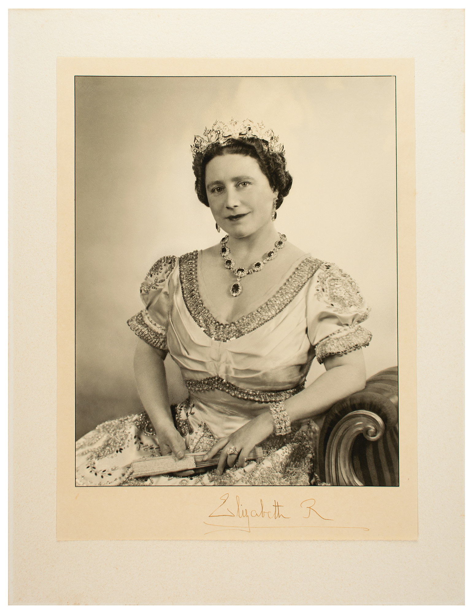 Vintage matte-finish 9 x 11.75 photo of the Queen Mother in her crown jewels by Royal Court photographer Dorothy Wilding, affixed to its original 13 x 17 mount, signed on the mount in fountain pen, "Elizabeth R." Reverse bears Wilding's studio label. In fine condition.