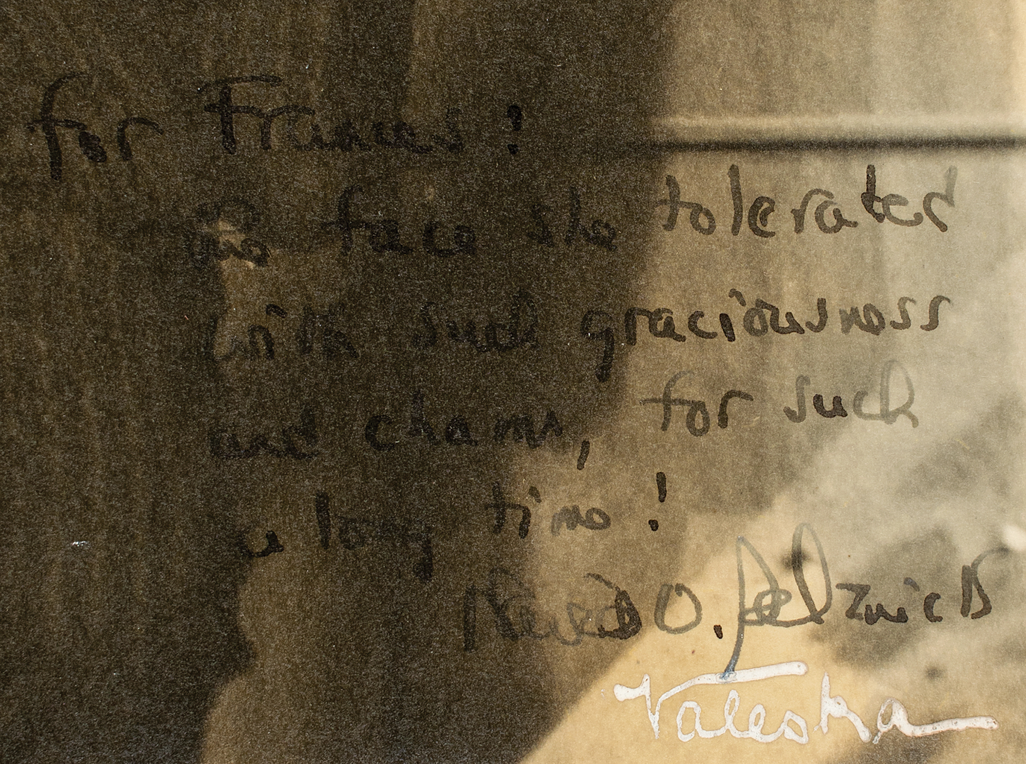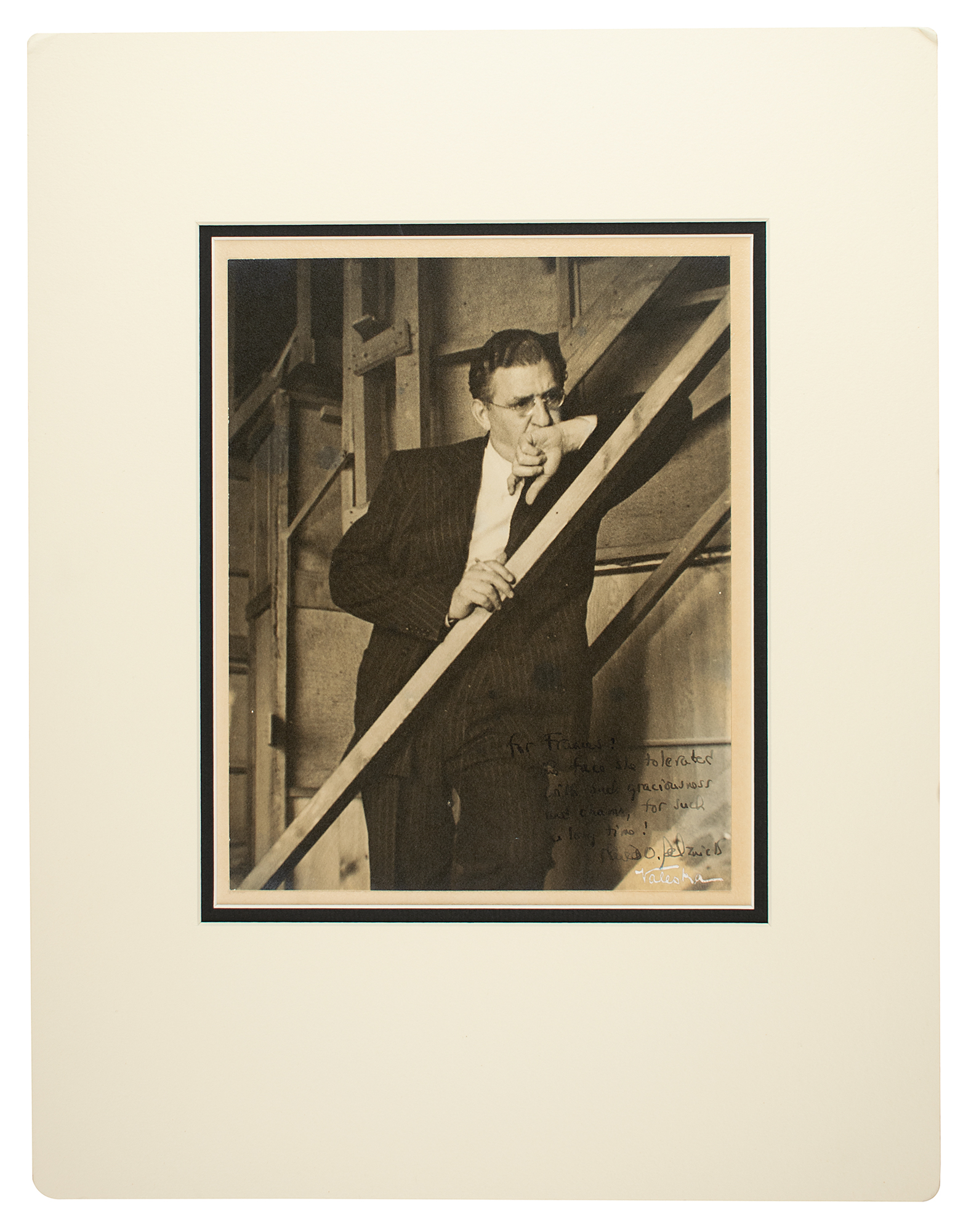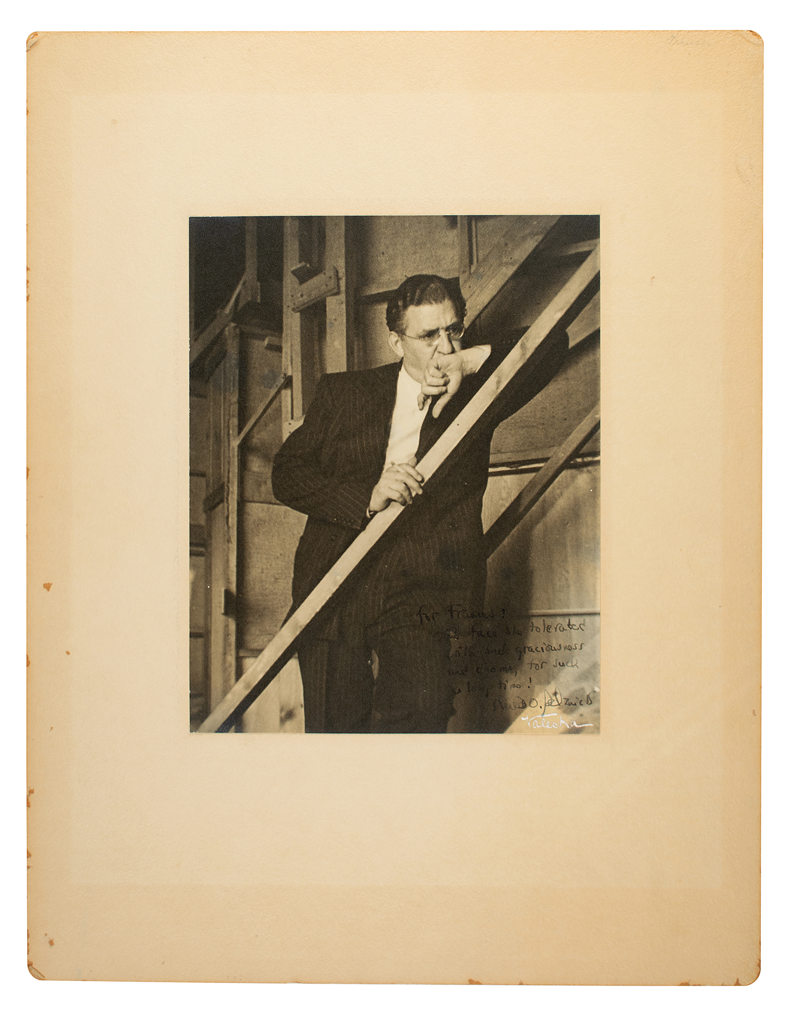Vintage matte-finish 7.75 x 9.75 photo of Selznick on set, signed and inscribed in fountain pen, "For Frances! The face she tolerated with such graciousness and charm, for such a long time! David O. Selznick.” Affixed to a larger mount, and double-matted to an overall size of 14 x 18. In fine condition, with light contrast to the inscription against the dark image.