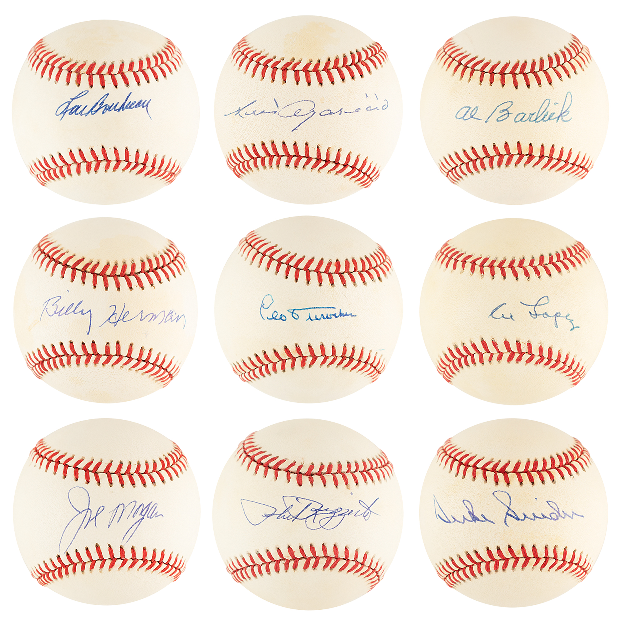 Nine official Rawlings American and National League baseballs, individually signed on the sweet spots in ballpoint by Hall of Famers. Signers are: Luis Aparicio, Al Barlick, Lou Boudreau, Leo Durocher, Billy Herman, Al Lopez, Joe Morgan, Phil Rizzuto, and Duke Snider. In overall fine condition, with some light toning.